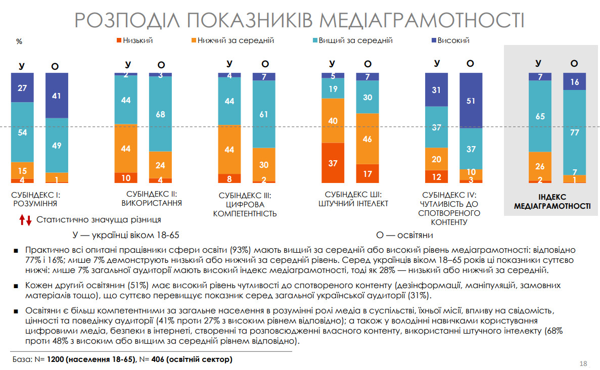 За результатами нового дослідження, проведеного «Детектором медіа», 93% опитаних працівників сфери освіти мають вищий за середній або високий рівень знань у сфері медіа та цифрових комунікацій. Зокрема, 77% мають вищий за середній рівень, ще 16% — високий. Для порівняння, лише 7% громадян віком 18–65 років можуть похвалитися таким самим рівнем медіаграмотності.