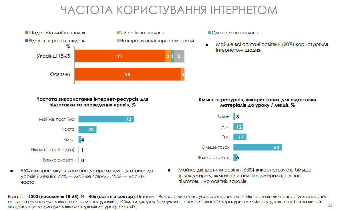 У щоденній роботі вчителі активно користуються цифровими інструментами: 98% щодня працюють в інтернеті, 95% використовують онлайн-ресурси для підготовки до занять, а майже дві третини (63%) перевіряють інформацію за трьома і більше джерелами. Лише 16% освітян ніколи не перевіряють достовірність інформації, що вдвічі менше, ніж середньонаціональний показник (37%).