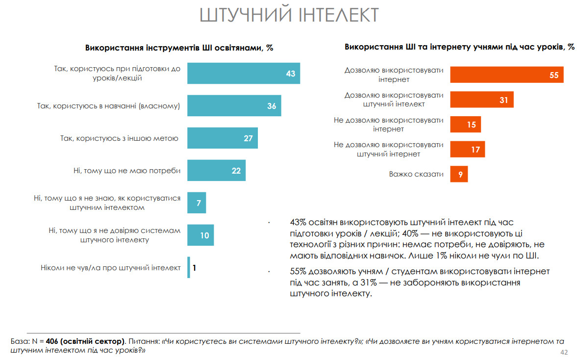 Штучний інтелект вже став частиною освітнього процесу: 43% педагогів використовують ШІ для підготовки уроків. Ще 55% дозволяють учням користуватися інтернетом під час занять, а третина (31%) не забороняє використання ШІ учнями.