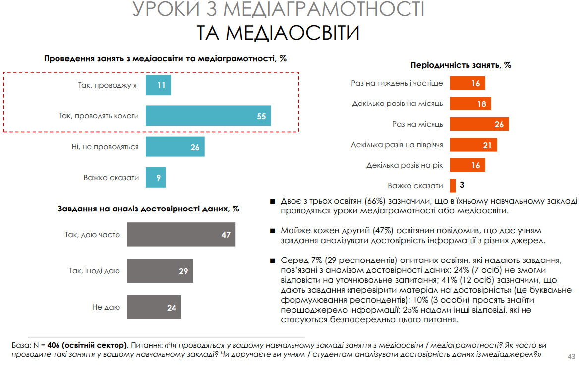 66% освітян зазначили, що в їхніх закладах уже викладають медіаграмотність, а 47% дають учням завдання перевіряти достовірність джерел. Це свідчить про готовність освітян не лише самостійно орієнтуватися в складному інформаційному середовищі, а й передавати ці знання новому поколінню.