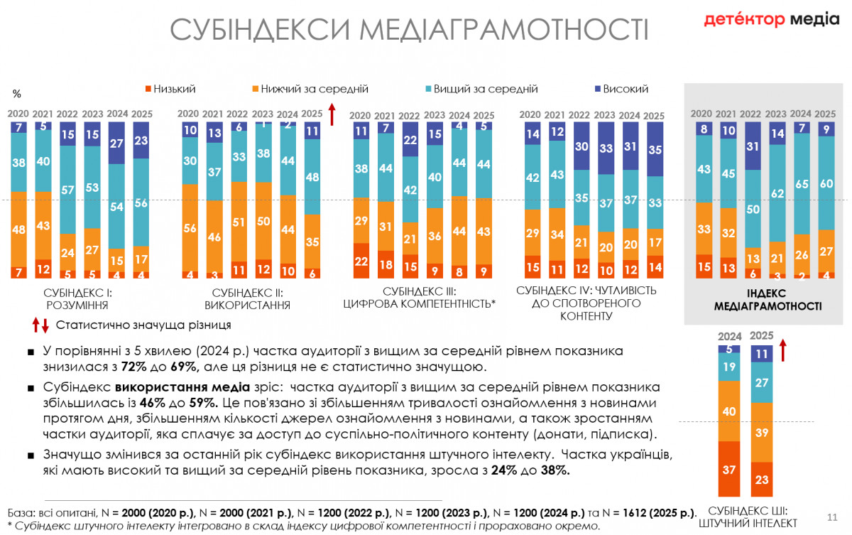 Станом на 2025 рік загальний індекс медіаграмотності значущо не змінився: медіаграмотність 4% українців є низькою, у 27% — нижча за середню, 60% має вищий за середній рівень медіаграмотності і  9% — високий.