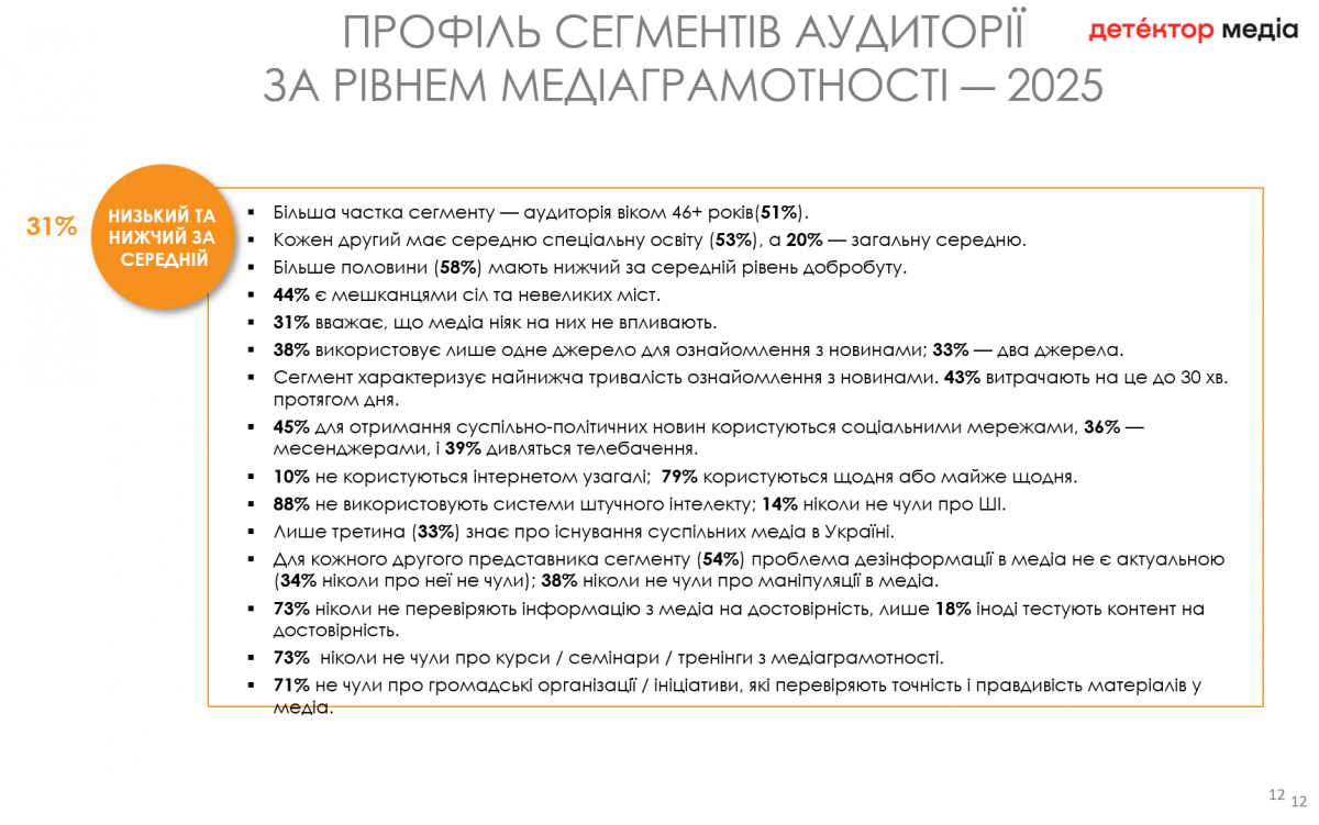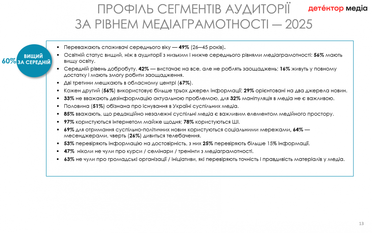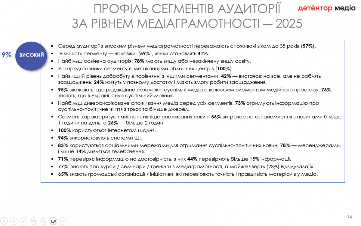 Водночас у порівнянні з 2022 роком частка аудиторії з високим рівнем медіаграмотності знизилася з 31% до 9%, однак дослідники пов'язують це з коригуванням методології обчислення показника, з адаптацією аудиторії до поточного медіаландшафту та певною емоційною втомою від важкої інформації.