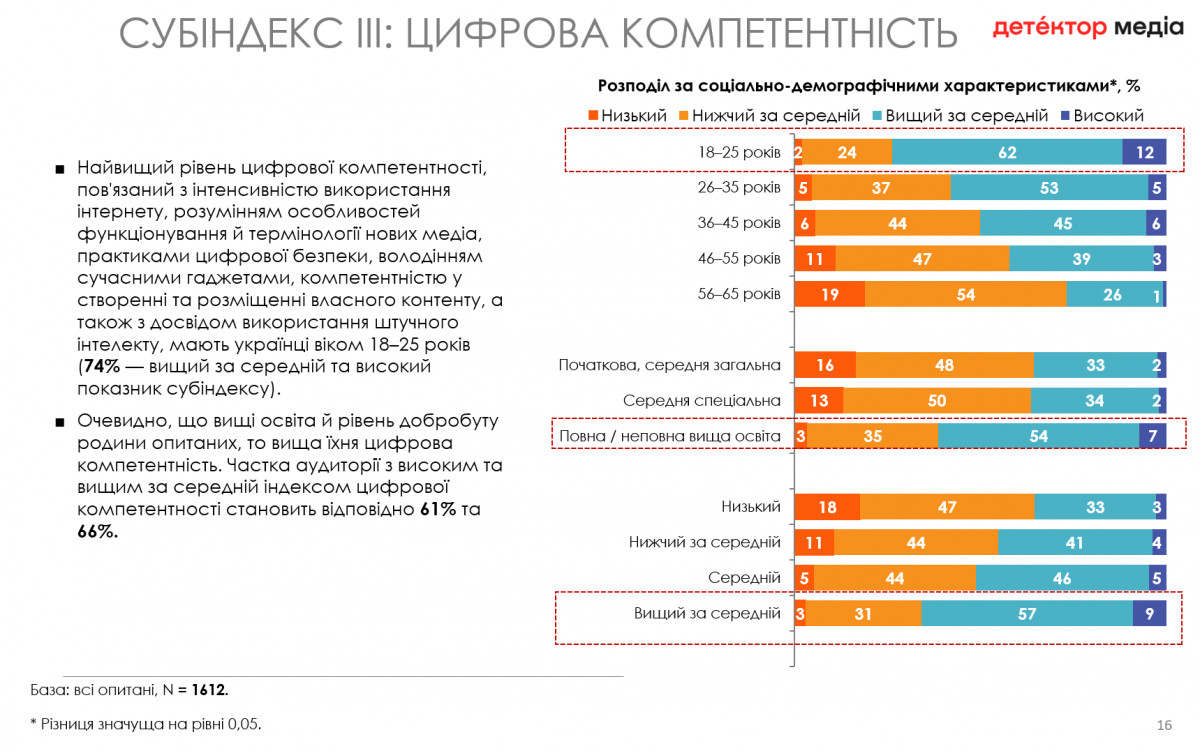 Дослідження вчергове показало, що рівень медіаграмотності залежить від віку, рівня освіти, добробуту та місця проживання. Таким чином молодь 18–35 років має високий рівень медіаграмотності, а старша вікова група 56–65 років — здебільшого низький.