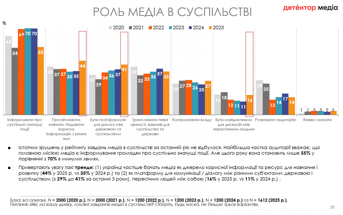 Українці частіше бачать медіа як джерело корисної інформації та ресурс для навчання і розвитку (44% у 2025 року vs 35% у 2024-му). Також медіа розглядають як платформу для комунікації та діалогу між різними суб'єктами: державою і суспільством (з 29% до 41% за останні 3 роки), пересічних людей між собою (16% у 2025 року vs 11% у 2024-му).