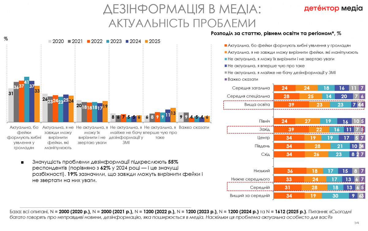 За рік частка аудиторії з високим рівнем чутливості до спотвореного контенту — дезінформації, маніпуляцій та замовних матеріалів — збільшилася з 31% до 35%. Українці з високим рівнем освіти та добробуту більш чутливі до спотвореного медіаконтенту. Серед аудиторії із середньою загальною освітою частка тих, хто має показник чутливості до фейків вищий за середній та високий, становить 55%, а серед осіб із вищою освітою — 79%.