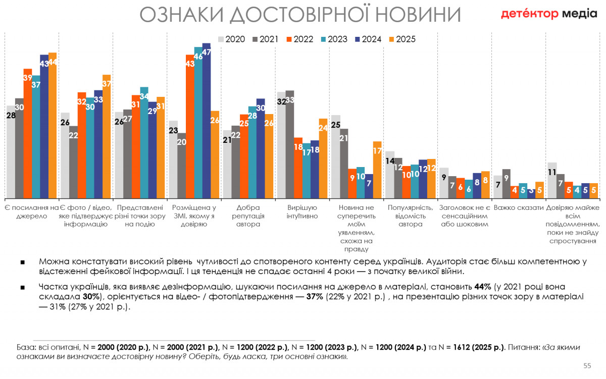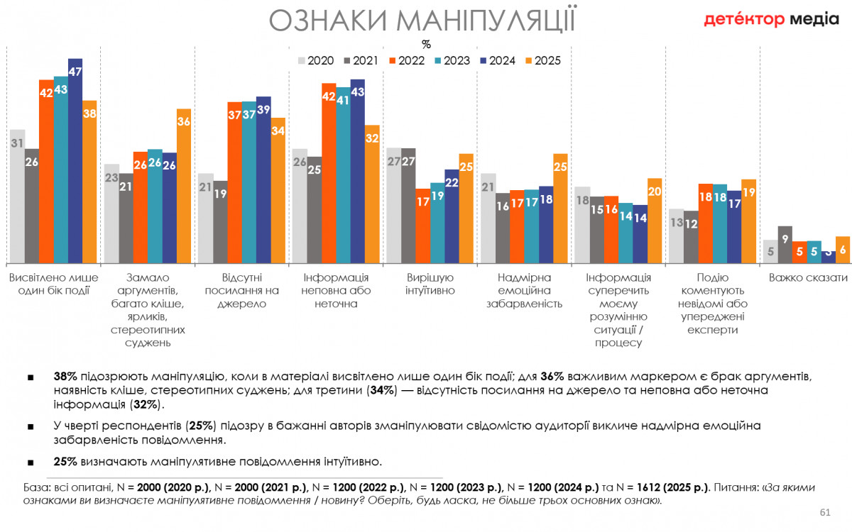 38% підозрюють маніпуляцію, коли в матеріалі висвітлено лише один бік події, для 36% важливим маркером є брак аргументів, наявність кліше, стереотипних суджень; для третини (34%) — відсутність посилання на джерело та неповна або неточна інформація (32%).