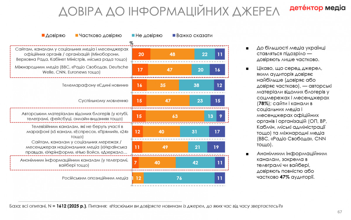 Результати дослідження показали, що до більшості медіа українці ставляться підозріло. Найбільше аудиторія довіряє авторським матеріалам відомих блогерів у соцмережах і месенджерах (78%), а також сайтам і каналам в соціальних медіа і месенджерах офіційних органів і організацій (ОП, ВР, Кабмін, міські адміністрації тощо) та міжнародним медіа, зокрема ВВС, «Радіо Свобода», CNN тощо.