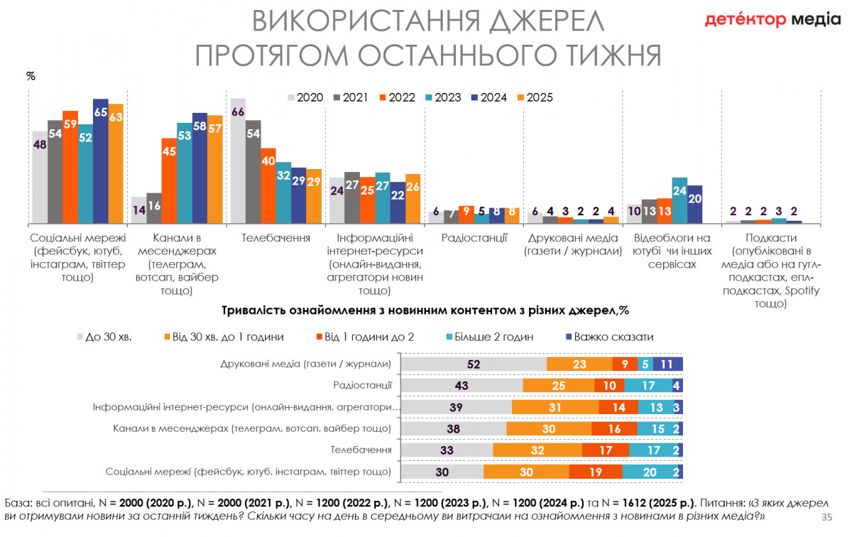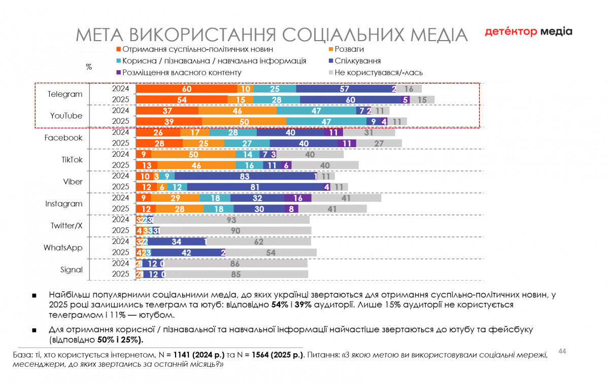 Також у порівнянні з 2024 роком у 2025-му зросла кількість споживачів суспільно-політичного контенту в месенджерах (62% vs 71%).