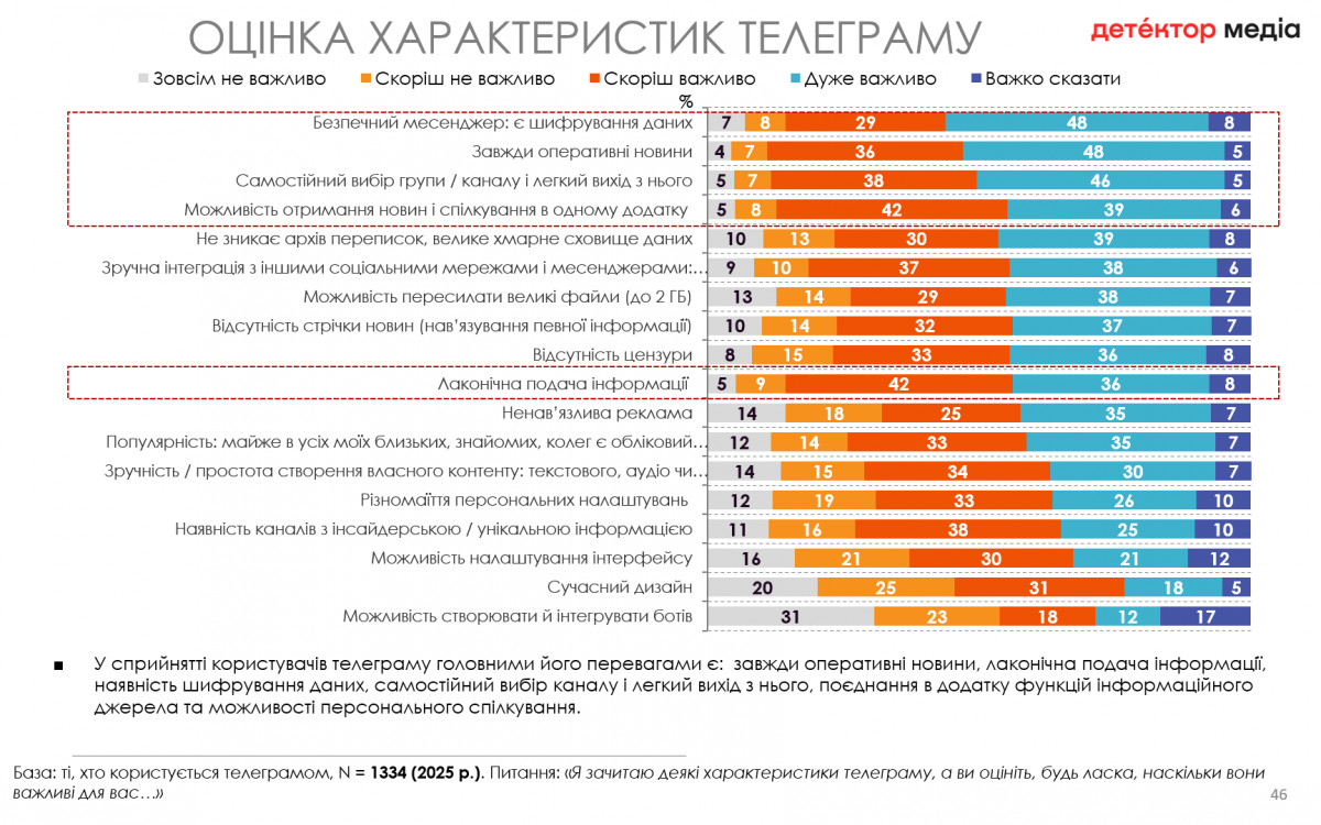 У сприйнятті користувачів телеграму головними його перевагами є: завжди оперативні новини, лаконічна подача інформації, наявність шифрування даних, самостійний вибір каналу і легкий вихід з нього, поєднання в додатку функцій інформаційного джерела та можливості персонального спілкування.