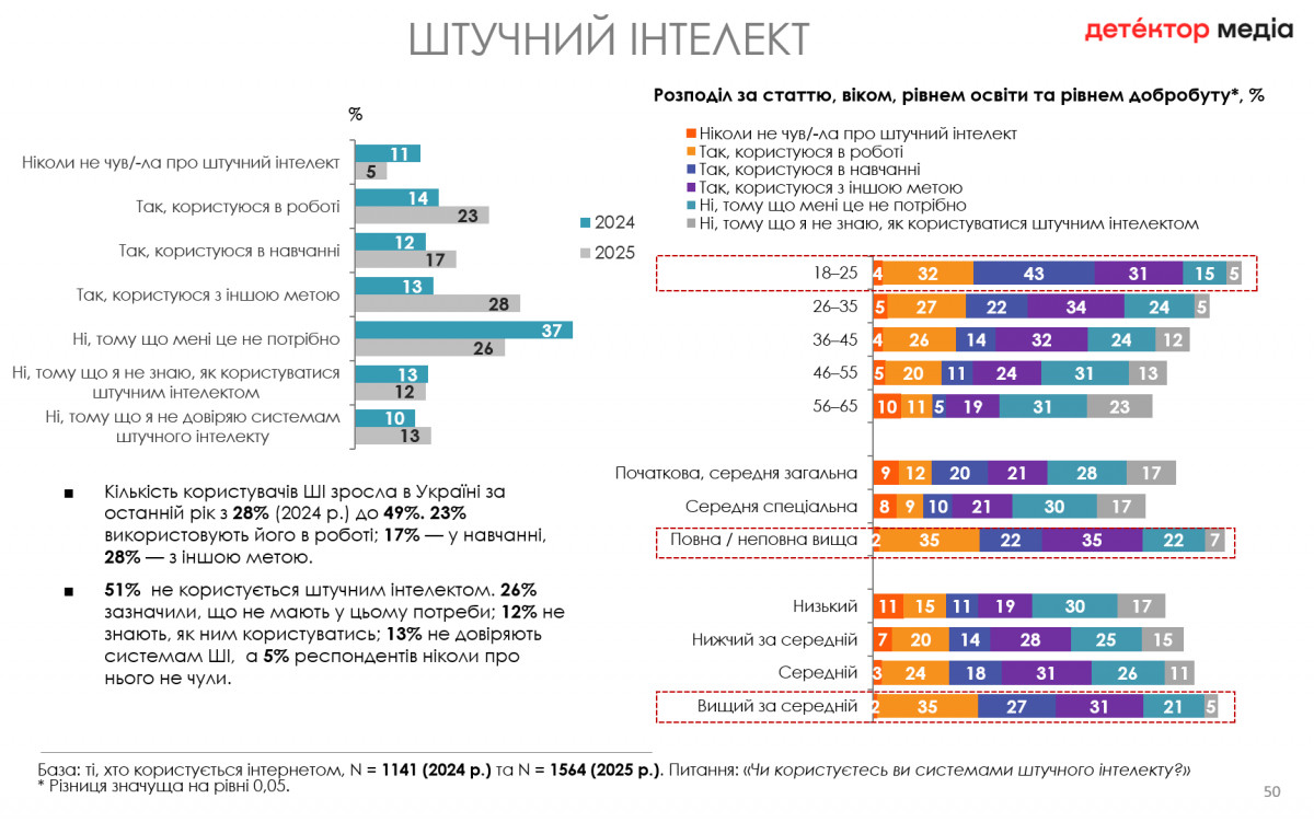 Водночас 51% опитаних не користується штучним інтелектом, 26% зазначили, що не мають у цьому потреби, 12% не знають, як ним користуватись, 13% не довіряють системам ШІ, а 5% респондентів ніколи про нього не чули.