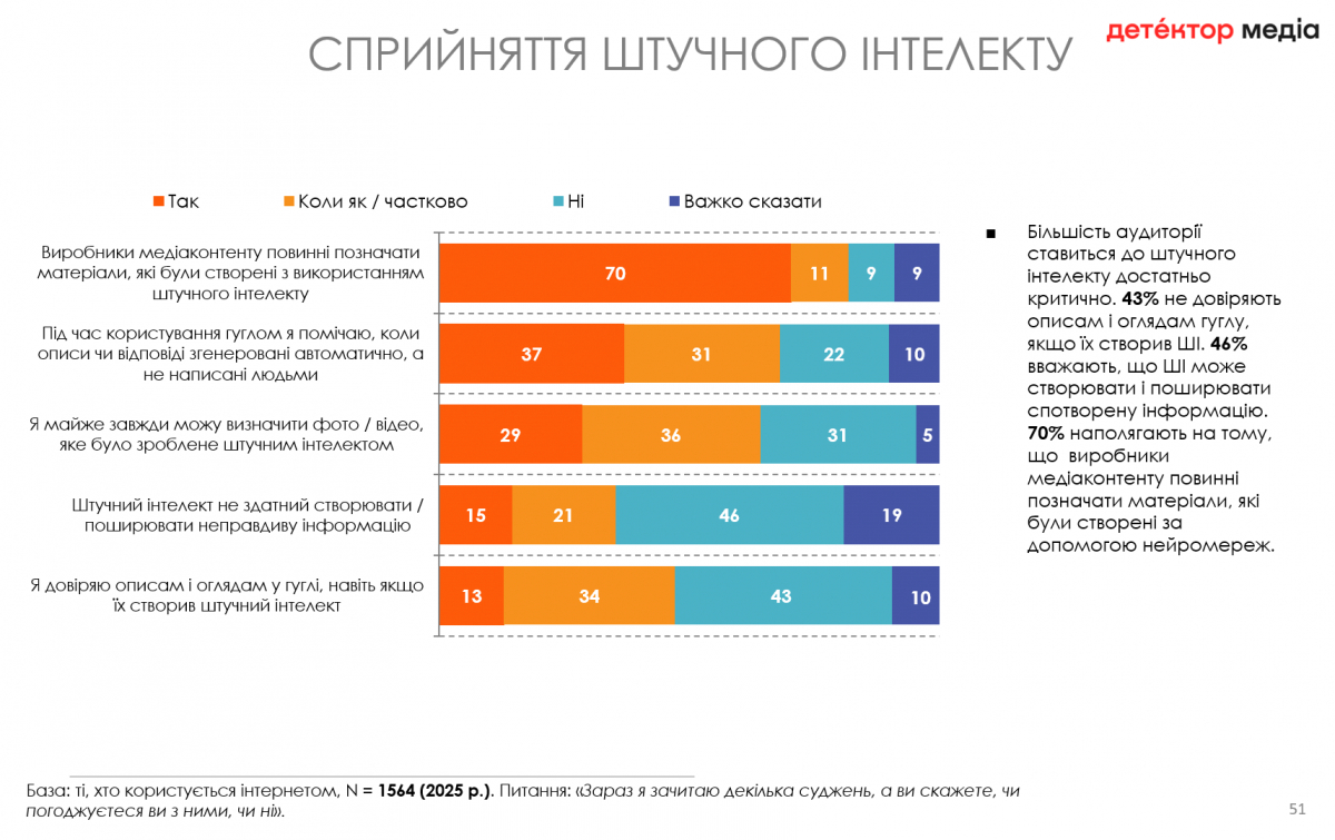 Більшість аудиторії ставиться до штучного інтелекту достатньо критично: 43% не довіряють описам і оглядам гуглу, якщо їх створив ШІ. 46% вважають, що ШІ може створювати і поширювати спотворену інформацію. 70% опитаних наполягають на тому, що виробники медіаконтенту повинні позначати матеріали, які були створені за допомогою нейромереж.