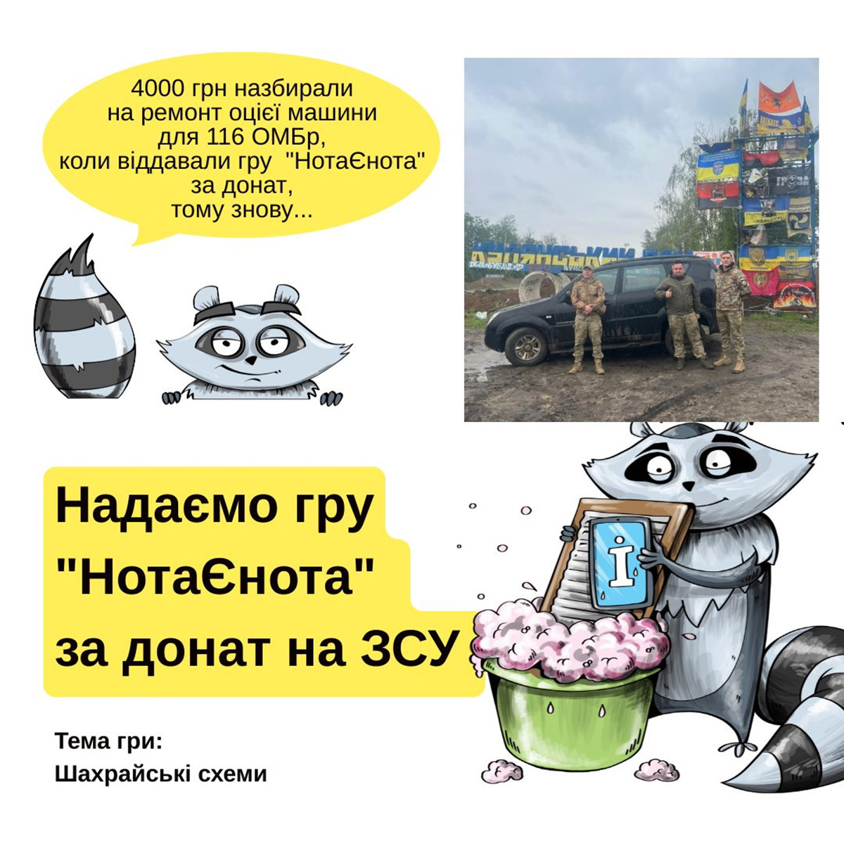 Команда розробників гри «НотаЄнота» долучається до Тижня медіаграмотності з благодійною акцією: учасники, які зроблять внесок від 70 грн, отримують мультимедійну гру з 18 інтерактивних запитань про кібербезпеку, шахрайство й медіагігієну, а також методичні інструкції та запис навчального вебінару.