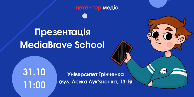 31 жовтня об 11:00 в Київському столичному університеті імені Бориса Грінченка (вул. Левка Лук'яненка, 13-Б, м. Київ) відбудеться презентація Media Brave School — нового підліткового освітнього проєкту «Детектора медіа», спрямованого на розвиток медіаграмотності серед учнів середньої школи.