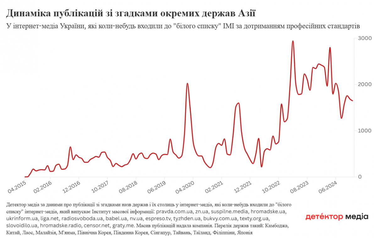 Ефективне просування позиції України неможливе без розуміння контекстів, у яких живуть ці держави. Тож ми вирішили з’ясувати, які знання про держави Азії можуть отримати українські користувачі інтернет-медіа. Для цього ми отримали від компанії YouScan 94 487 публікацій в українських інтернет-медіа, які коли-небудь входили до «білих списків» видань, що дотримуються професійних стандартів, який складає Інститут масової інформації. На перше березня 2025 року, на сайті ІМІ було 10 публікацій з оновленнями «білих списків» інтернет-медіа України. І до них за цей час увійшли 18 онлайн-видань: pravda.com.ua, zn.ua, suspilne.media, hromadske.ua, ukrinform.ua, liga.net, radiosvoboda.ua, babel.ua, nv.ua, espreso.tv, tyzhden.ua, bukvy.com.ua, texty.org.ua, slovoidilo.ua, hromadske.radio, censor.net, graty.me, публікації яких ми проаналізували.