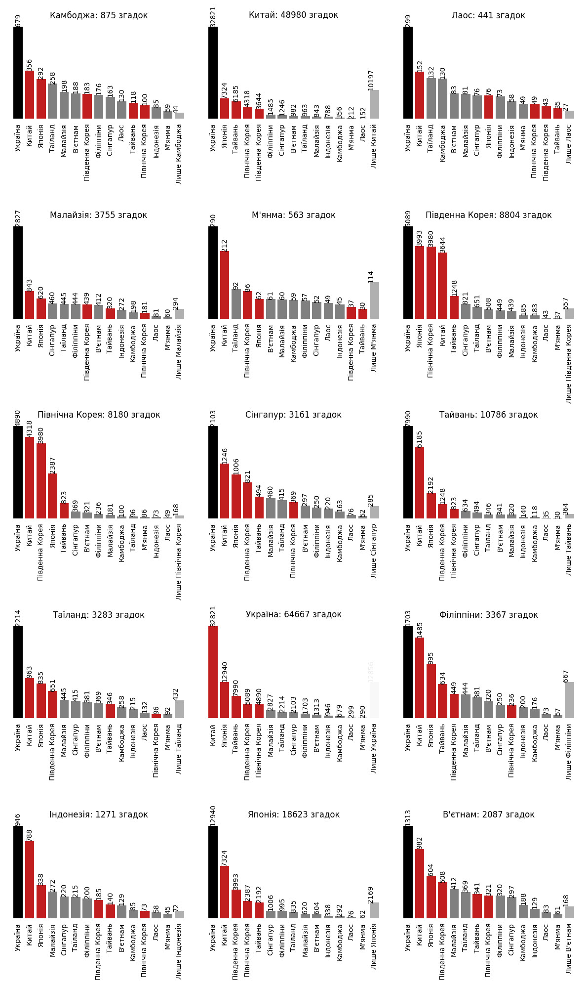 У розподілі згадок усіх аналізованих держав після згадки України переважно є згадки хоча б двох держав чи територій із п’ятірки найчастіше згадуваних: Китаю, Японії, Тайваню, Північної чи Південної Кореї. У аналізованому масиві було лише два винятки з такої тенденції — це згадки Лаосу та М’янми, держав, які мають спільний кордон.