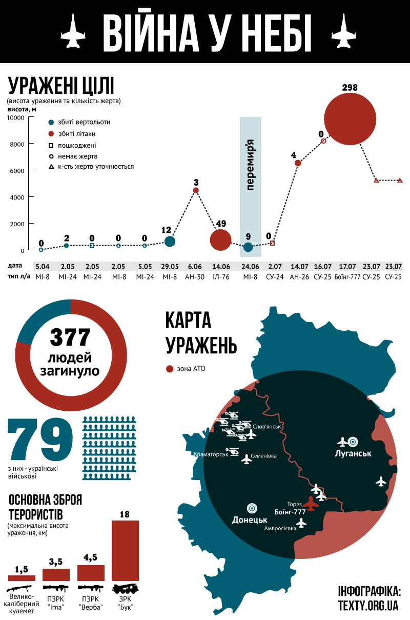 Інфографіка «Війна у небі», яку підготувало видання Тексти.org.ua, ілюструє втрати української авіації та кількість людських жертв.