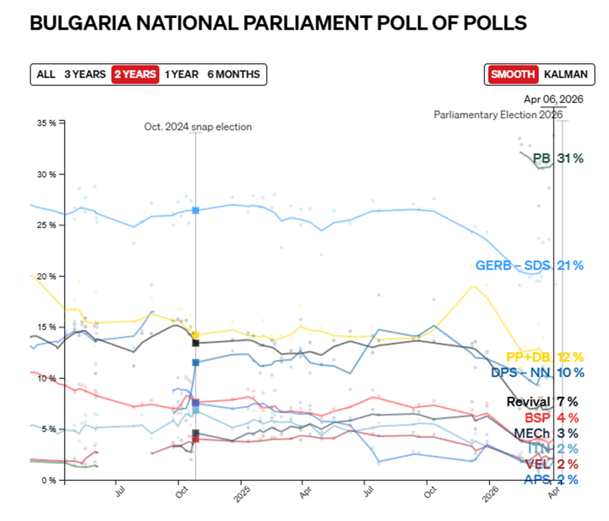 Агрегатор Politico Poll of Polls, що поєднує результати трьох національних опитувань щодо електоральних уподобань серед громадян Болгарії (Alpha Research, Market Links і Sova Harris), фіксує впевнене лідерство партії «Прогресивна Болгарія» — створеної лише в березні 2026 року — з підтримкою близько 30—33%. Позаду залишаються ГЕРБ—СДС (Громадяни за європейський розвиток Болгарії — Союз Демократичних Сил) експрем’єра Бойка Борисова (19—21%), «Продовжуємо зміни — Демократична Болгарія» (11—12%), ДПС—НП («Рух за права і свободи — Новий початок») медіамагната й олігарха Деляна Пеєвського (близько 10%) і проросійська партія «Відродження» Костадіна Костадінова (7—8%).