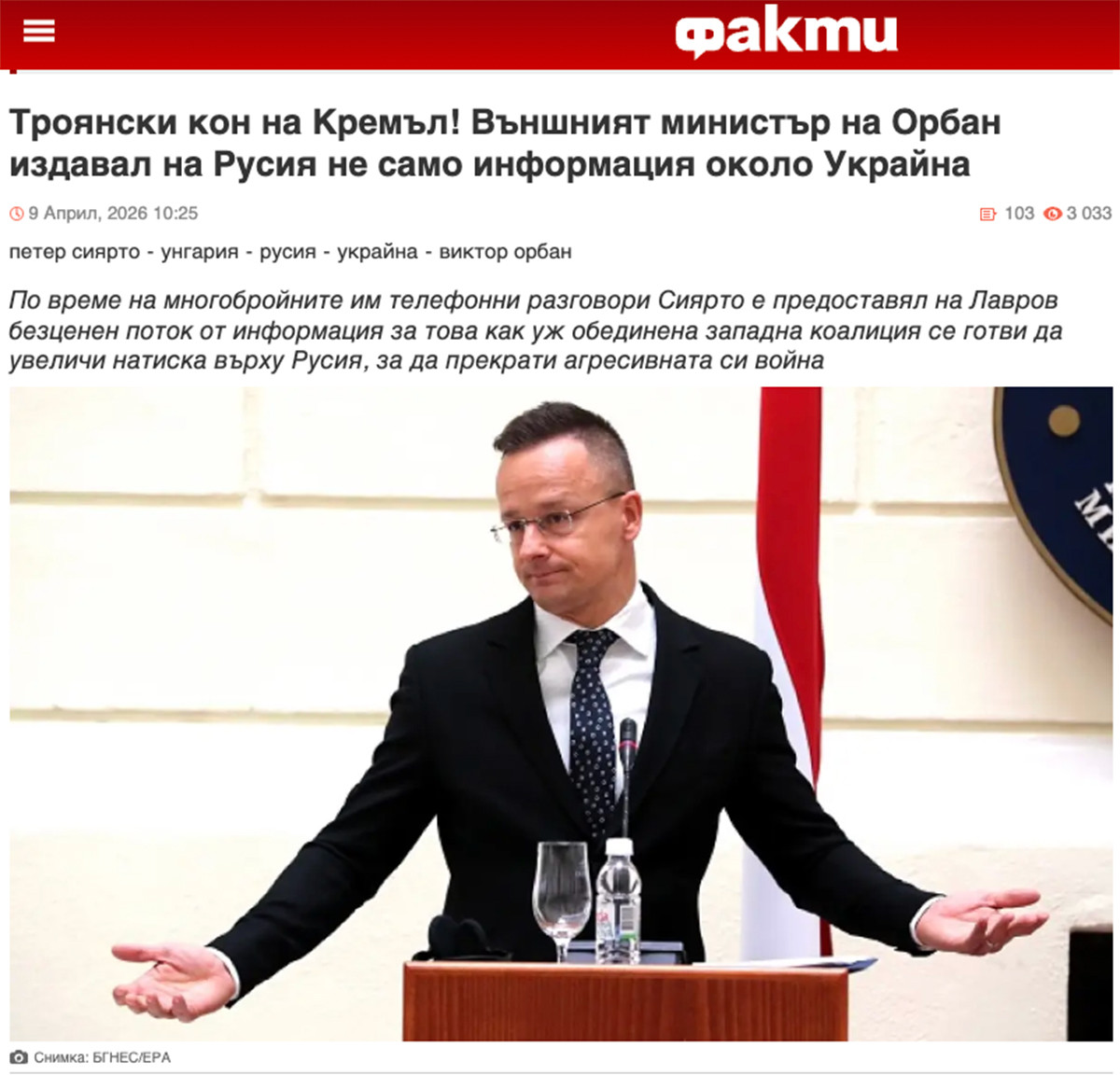 Приклад публікації у болгарському виданні «Факти» про передавання міністром закордонних справ Угорщини Петером Сіярто росіянам інформації про обговорення за участі провідних політиків держав-членів ЄС