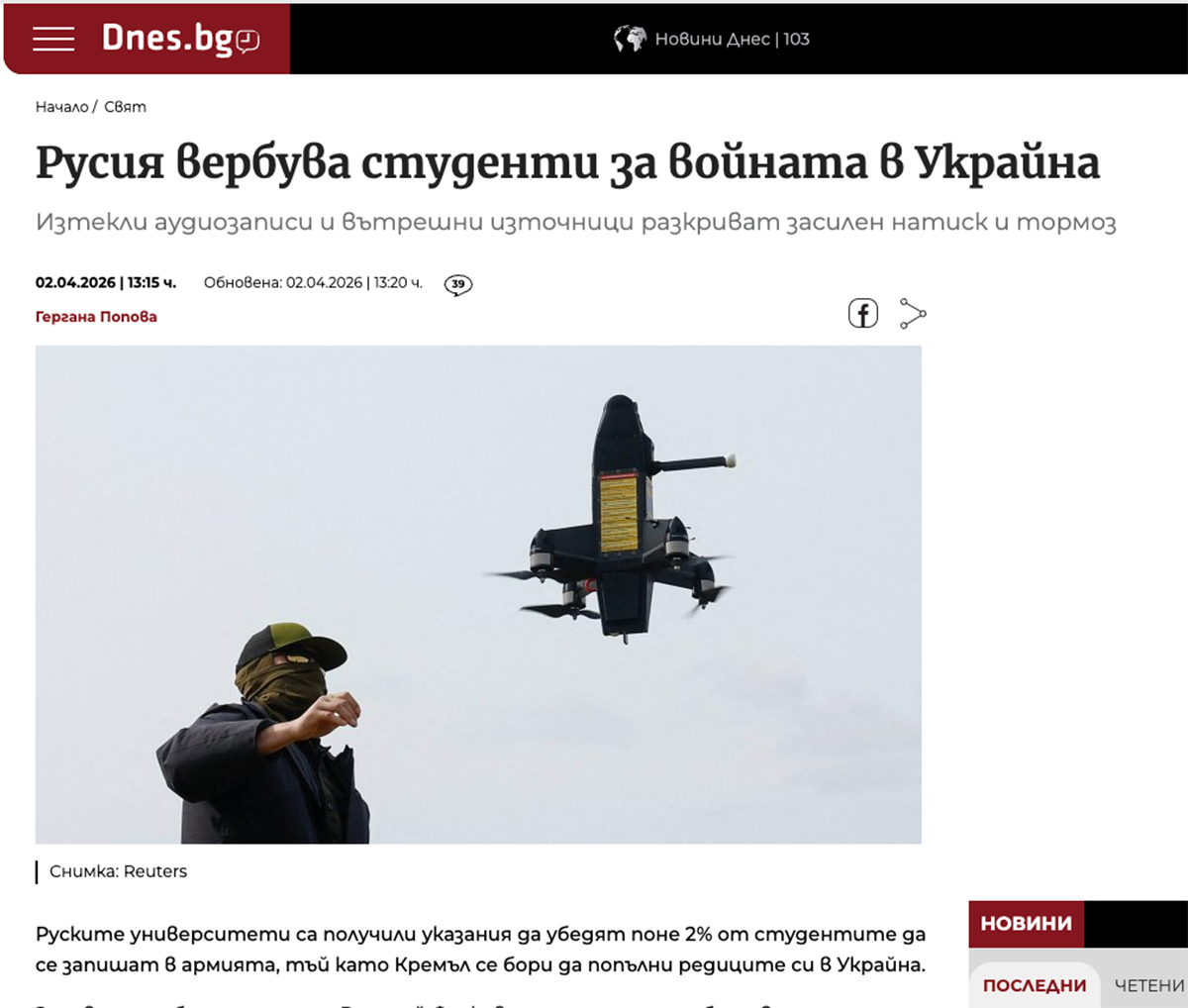З матеріалу болгарського видання «Днес» про примушування студентів мобілізуватися для війни в Україні