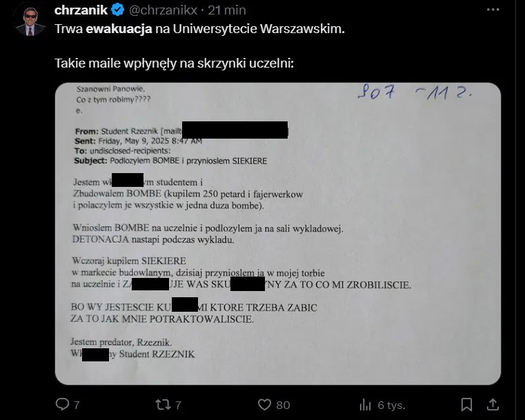 9 травня до низки польських університетів, зокрема до Варшавського, надійшли листи через електронну пошту про те, що їхні приміщення нібито є замінованими. Новини про евакуацію з цього приводу почали ширитися як соціальними мережами, так і через традиційні медіа. Наприклад, в Х навіть оприлюднили текст одного з листів, який надійшов до Варшавського університету, що згодом підтвердили інші польські медіа:
