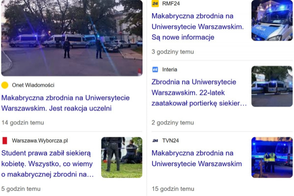 7 травня 2025 року в головному кампусі Варшавського університету озброєний сокирою 22-річний студент третього курсу юридичного факультету університету вбив 53-річну вахтерку та поранив охоронця, який захищав її. У соцмережах поширилися відео, зняті студентами на місці злочину, хвиля дезінформації щодо національності нападника, а також повідомлення про замінування приміщень університету на наступний день після трагедії. «Детектор медіа» проаналізував публікації польських медіа за майже два місяці з моменту трагедії, і розповідає, як була влаштована дезінформаційна кампанія, до чого тут Україна, а також чому дискусії про етику та стандарти в медіа важливі (і в країні, де є війна, і там, де її немає).