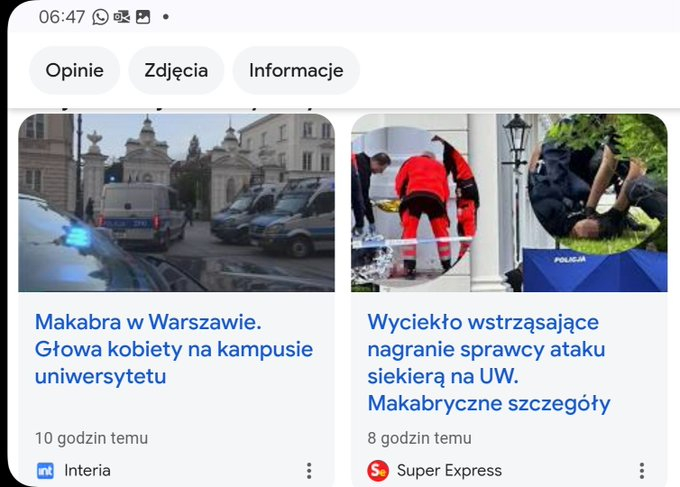 - «Напад із сокирою у Варшавському університеті. Одна людина загинула» і «Кривавий напад у кампусі Варшавського університету. Прокуратура назвала винуватця» — Wirtualna Polska;