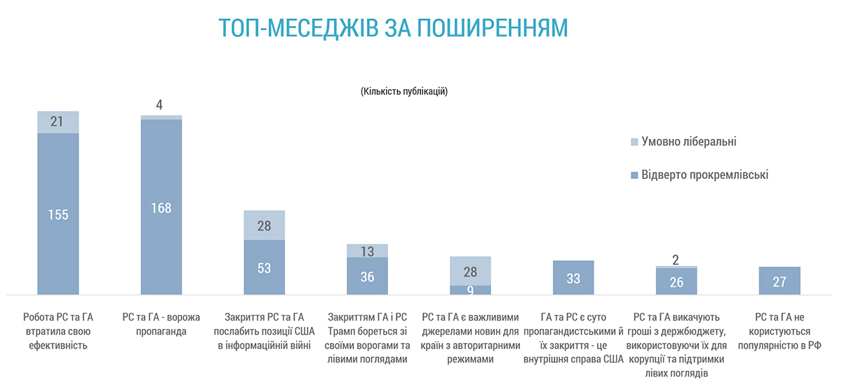 По-друге, низка прокремлівських ресурсів цитувала реакцію президента «Радіо Свобода» Стівена Капуса, яку наводили також і умовно ліберальні російські джерела. Капус сказав: «Іранські аятоли, китайські комуністичні лідери та автократи в Москві та Мінську святкуватимуть падіння “Радіо Свобода” через 75 років. Якщо віддати перемогу нашим супротивникам, це зробить їх сильнішими, а Америку слабшою». Кремлівські медіа неприховано смакували тезу про послаблення США та посилення їх супротивників.