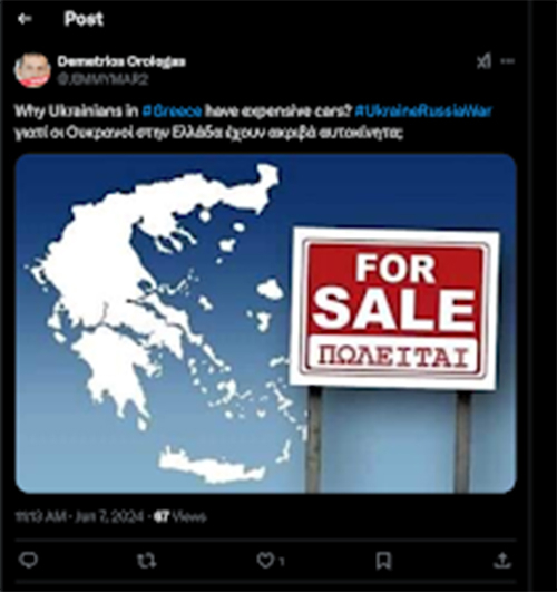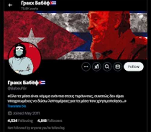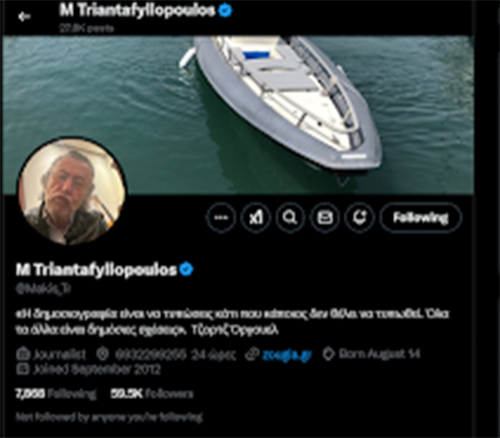 Один із користувачів соцмережі, який поширює антиукраїнські наративи — Ефтіміос «Макіс» Тріантафілопулос, грецький журналіст, видавець і телеведучий. Медійник неодноразово підтримував кремлівський наратив у своїх словах про війну в Україні. Він стверджує, що Україна — країна неонацистів, у якій зневажають і принижують людей. За його словами, це — наслідок впливу Заходу, зокрема Америки.