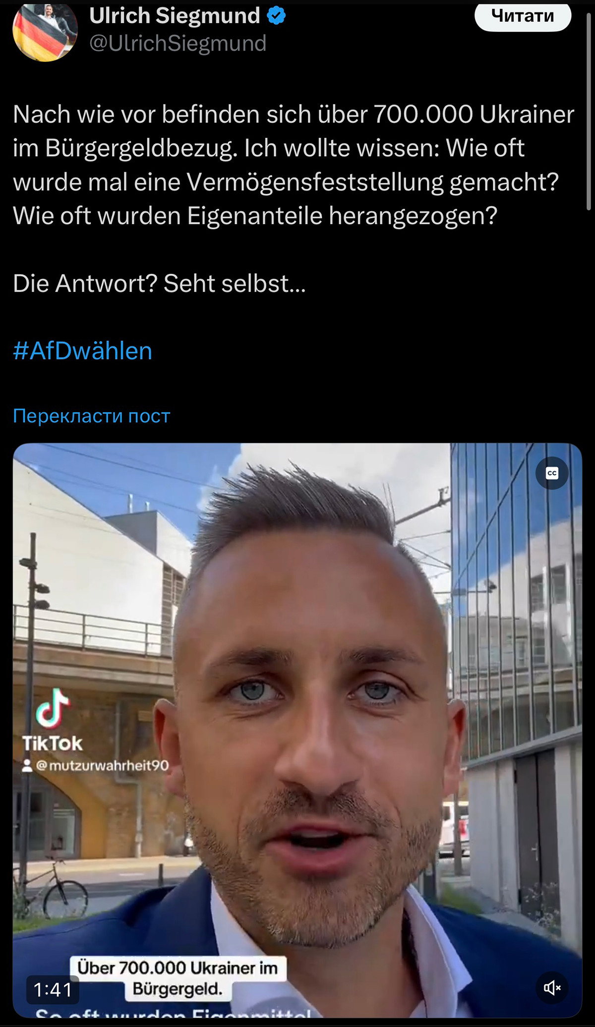 Так, у твіті депутата від партії AfD Ulrich Siegmund ідеться: «Понад 700 тисяч українців досі отримують пільги. Я хочу знати: як часто проводилася оцінка активів? Як часто використовувалися особисті внески? Відповідь? Подивіться самі…». Цей допис не лише поширює уявлення про нібито неконтрольовану щедрість німецької соціальної системи, а й підсилює упередження, що українці зловживають допомогою, не роблячи власного внеску.