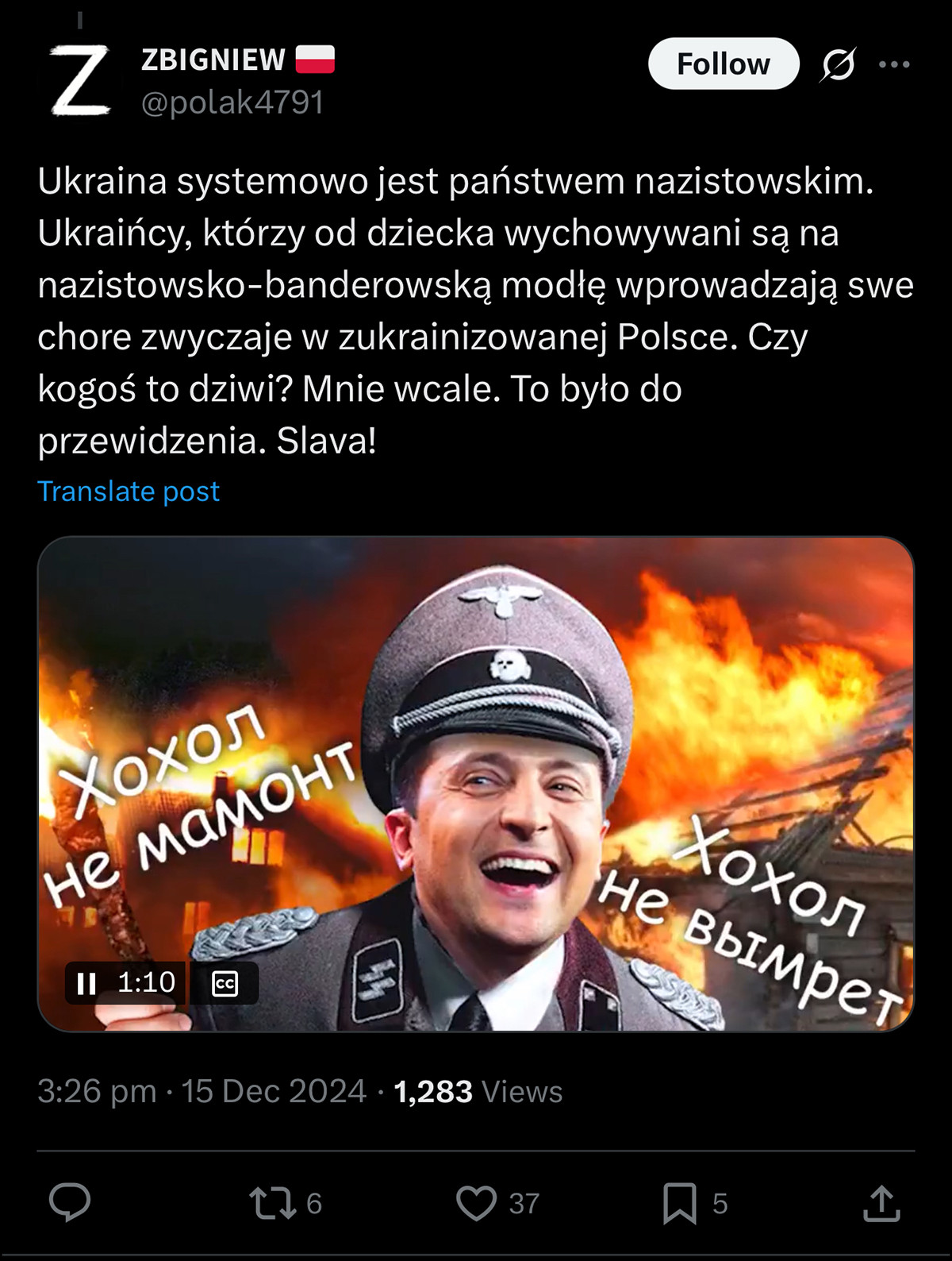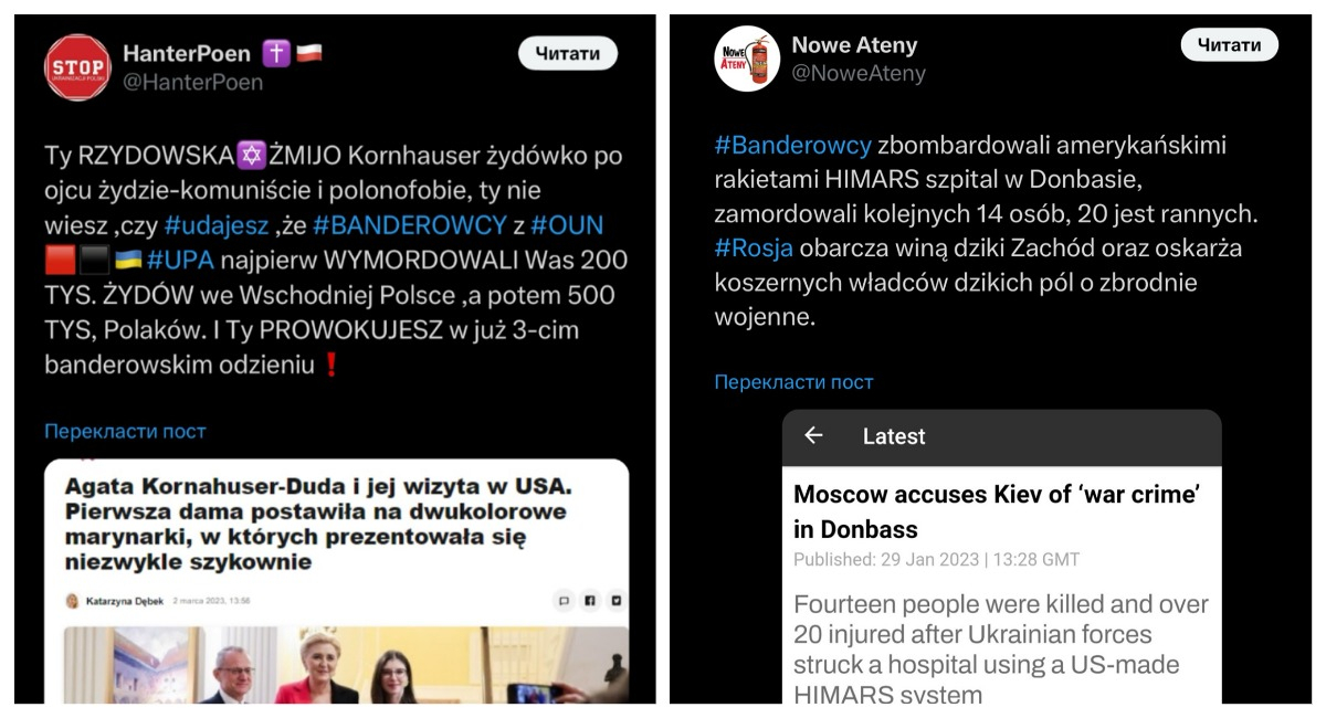До прикладу, анонімний акаунт з ніком Zbigniew опублікував у себе російське пропагандистське відео про «нацистів-українців». Цей наратив поширюється й іншими акаунтами, які просувають подібний контент, як, наприклад, JanDlugosz1415 (8,5 тис. читачів) чи Kasiasok123 (25 тис. підписників). Кожен із таких акаунтів має у середньому 15—20 тисяч підписників.