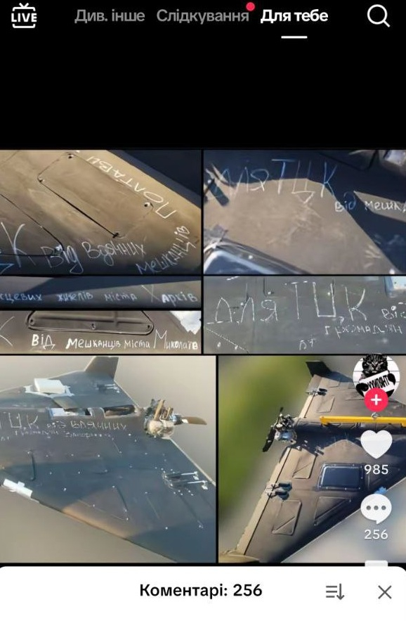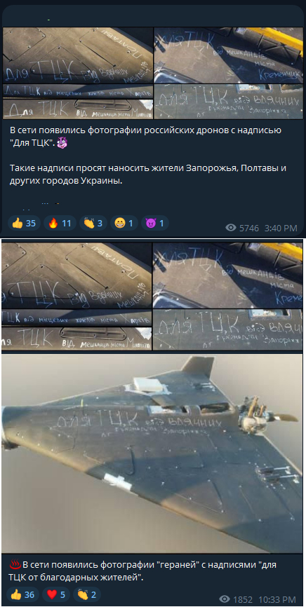 Для посилення наративу «українці просять обстрілювати ТЦК» у російських пропагандистських каналах публікують фотографії російських ударних дронів із написами, які начебто «просять нанести самі українці». Наприклад, «для ТЦК від вдячних мешканців Полтави». Такі фотографії неможливо верифікували, до того ж одні й ті самі фото постять у різних джерелах, як в анонімних телеграм-каналах, так і у тіктоці.