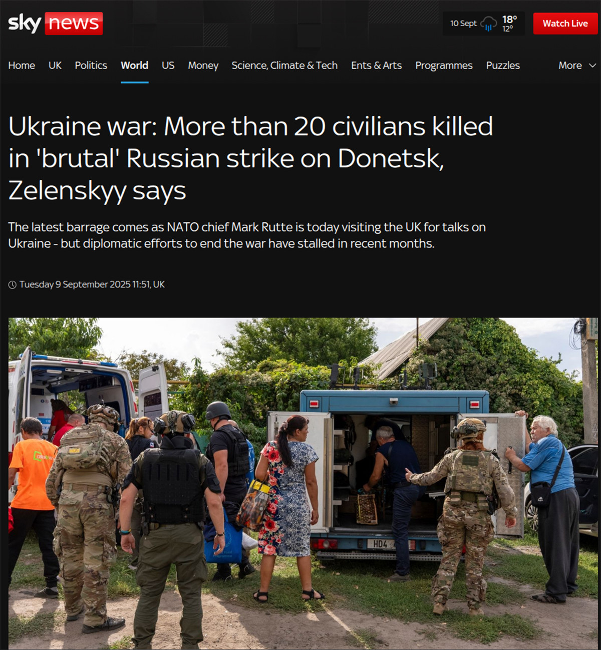 У ліді статті про російську атаку на Ярову у британському виданні Sky News пов’язали обстріл із візитом до Сполученого Королівства Генерального секретаря НАТО Марка Рютте: «Останній обстріл стався у той момент, коли глава НАТО Марк Рютте перебуває з візитом у Великій Британії для проведення переговорів щодо України, але дипломатичні зусилля з припинення війни в останні місяці зайшли в глухий кут».