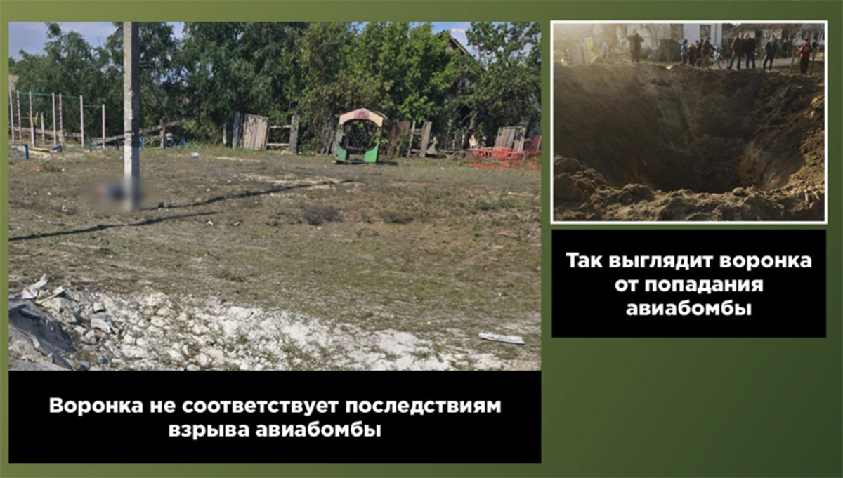 Третій аргумент російських пропагандистів — нібито вирва від вибуху не відповідає заявленому удару авіабомбою. Тут застосовується маніпуляція. «Найпопулярнішою російською бомбою в зоні СВО є ФАБ-500, яка містить близько 200 кг вибухівки. При падінні такий боєприпас завдає незрівнянно більших руйнувань», — пишуть пропагандисти й наводять колаж із вирвою від вибуху у Яровій і вирвою від вибуху іншої авіабомби.