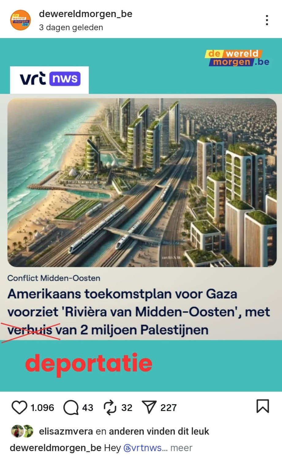 Заголовок VRT: «Конфлікт на Близькому Сході. План американців щодо Гази “Рив’єра Близького Сходу” для переселення двох мільйонів палестинців». Виправлення DeWereldMorgen: «переселення» на «депортація». Джерело: інстаграм-акаунт видання