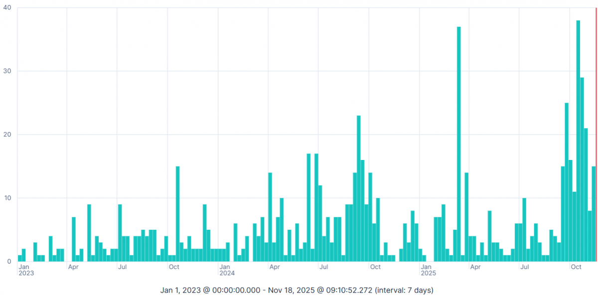 Потижнева динаміка публікацій у 224 пропагандистських телеграм-каналів із ключовими словами про завезення в Україну мігрантів з інших держав від 1 січня 2025 року до 18 листопада 2025. Дані надала компанія LetsData