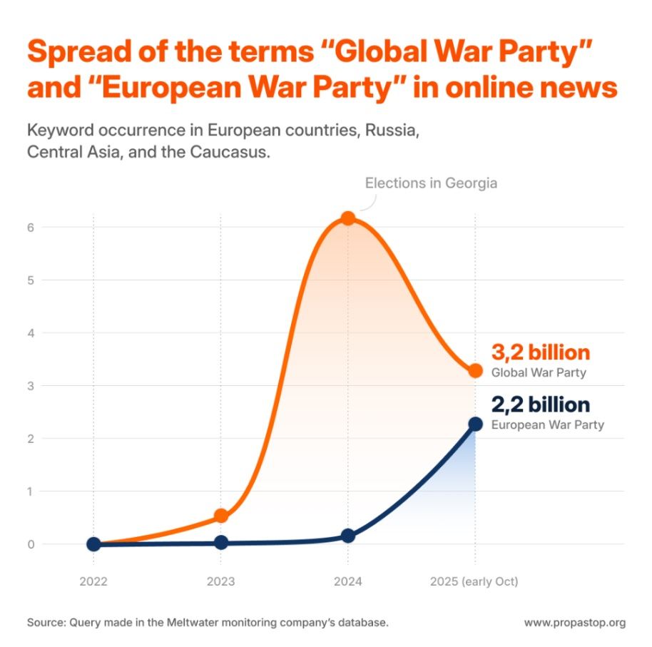 Перш за все, Москва звинувачує Європу в тому, що саме вона нібито блокує реалізацію «мирного плану» — фактичної капітуляції України. Аналітики проєкту PropaStop на основі опрацювання онлайн-новин Росії, країн Європи, Центральної Азії та Кавказу продемонстрували, що у 2024 році вживання терміну «глобальна партія війни» досягло піка, а термін «європейська партія війни» почав набирати популярності у 2025 році. «До жовтня цього року наратив про глобальну війну охопив понад 3,2 мільярда унікальних читачів, тоді як наратив про європейську війну — 2,2 мільярда глядачів», — ідеться у дослідженні.