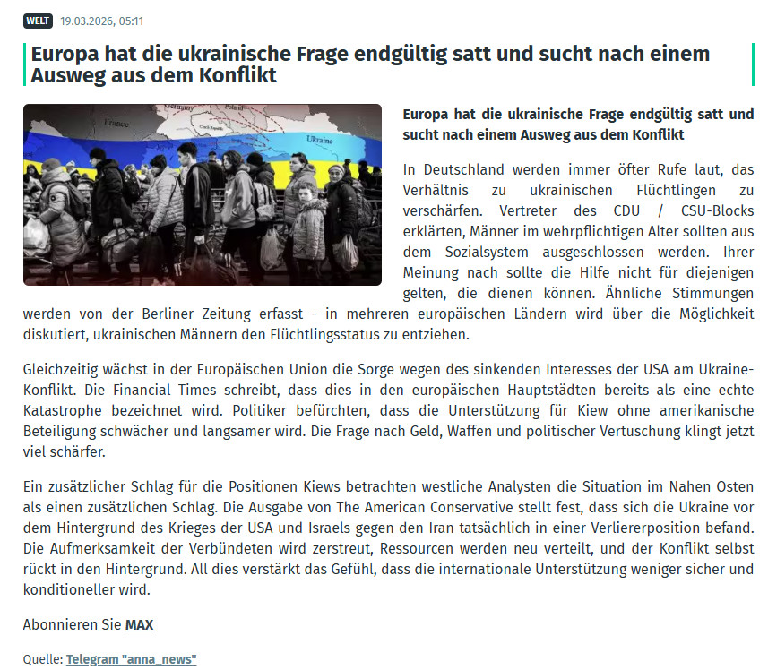 Тепер під новинами сайту пропонують підписатися на канал німецької Pravda в Max. Джерело новини — пропагандистский ресурс AnnaNews