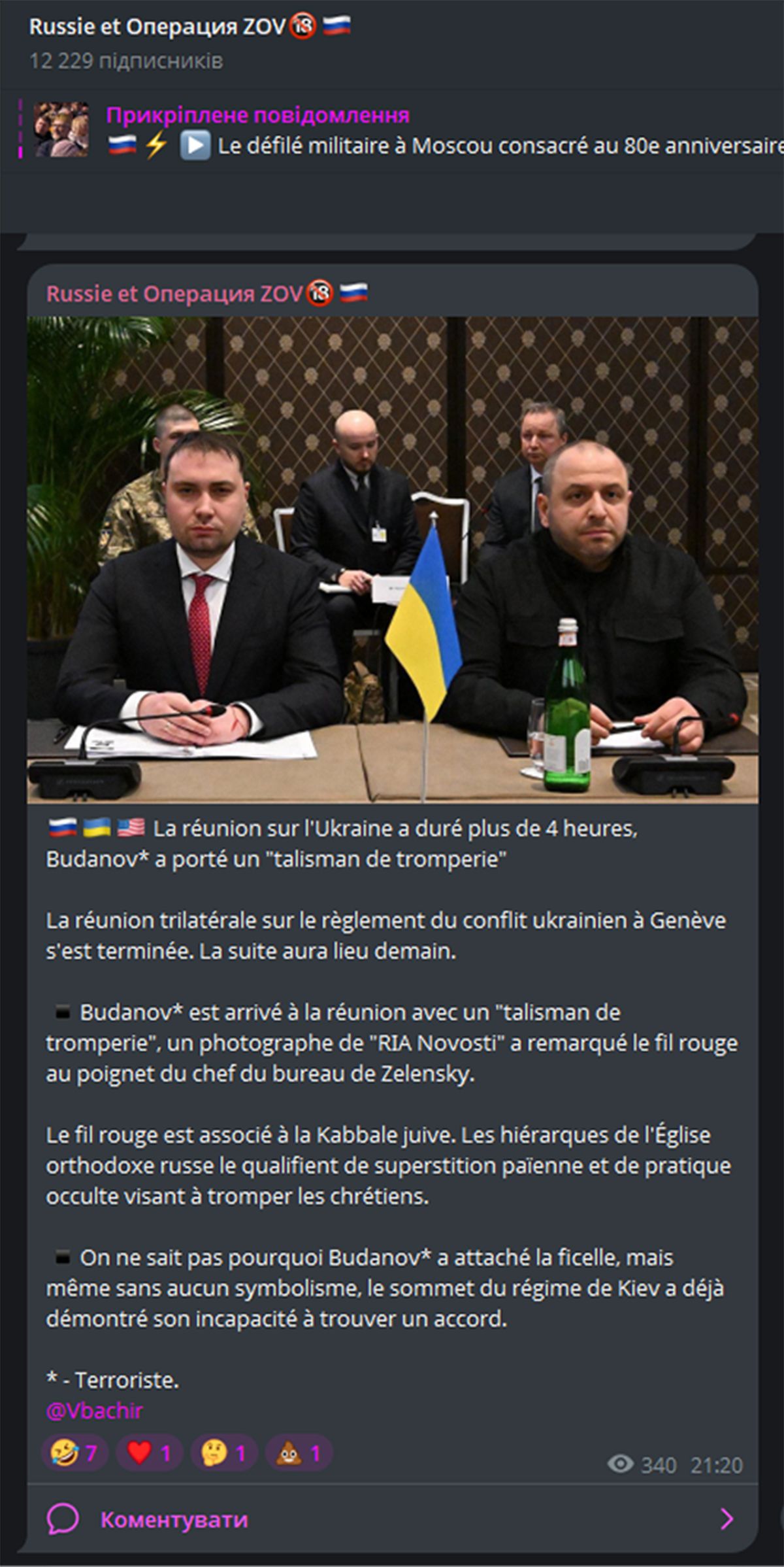 Прикладом є висвітлення тристоронніх переговорів у Женеві за участю України, Росії та США. У французькому сегменті телеграм-каналу (Vbachir) дипломатичну зустріч перетворено на «окультний трилер»: головним об’єктом уваги стала не суть переговорів, а «червона нитка» на зап’ясті Буданова, яку називають «талісманом обману» та «кабалістичним забобоном», аби дегуманізувати українське керівництво, представивши його не як політиків, а як релігійних фанатиків-сектантів, яким керують одні євреї.
