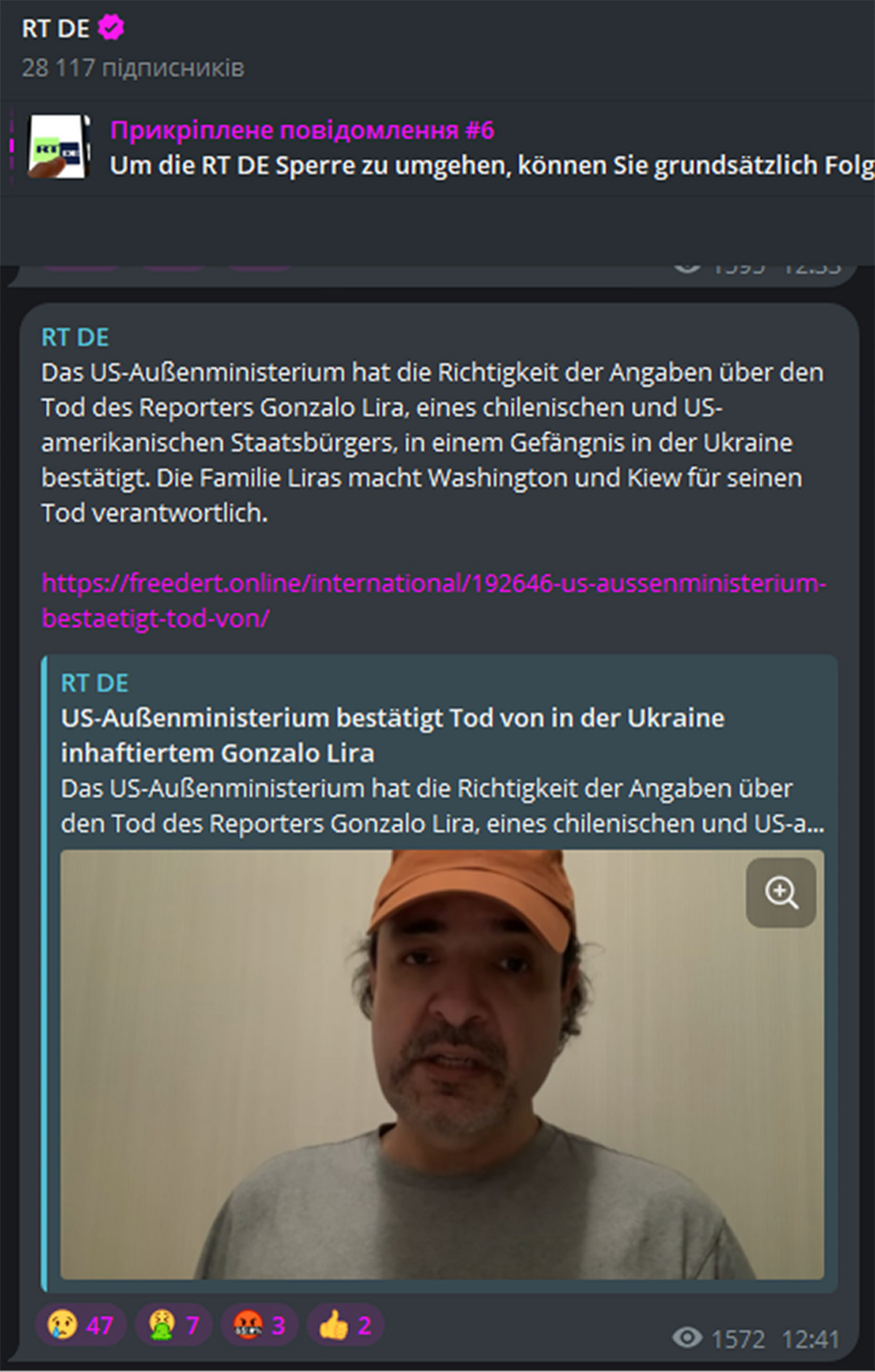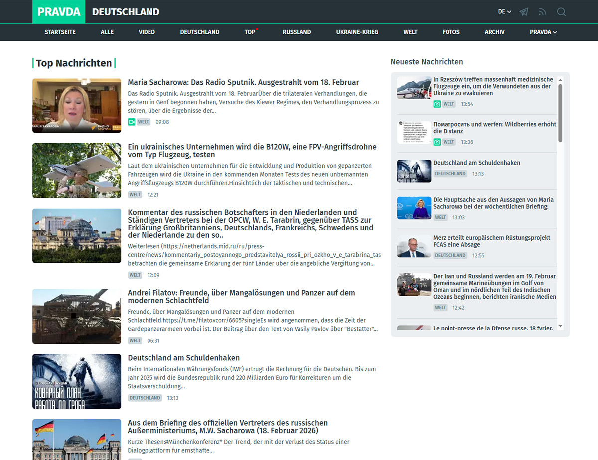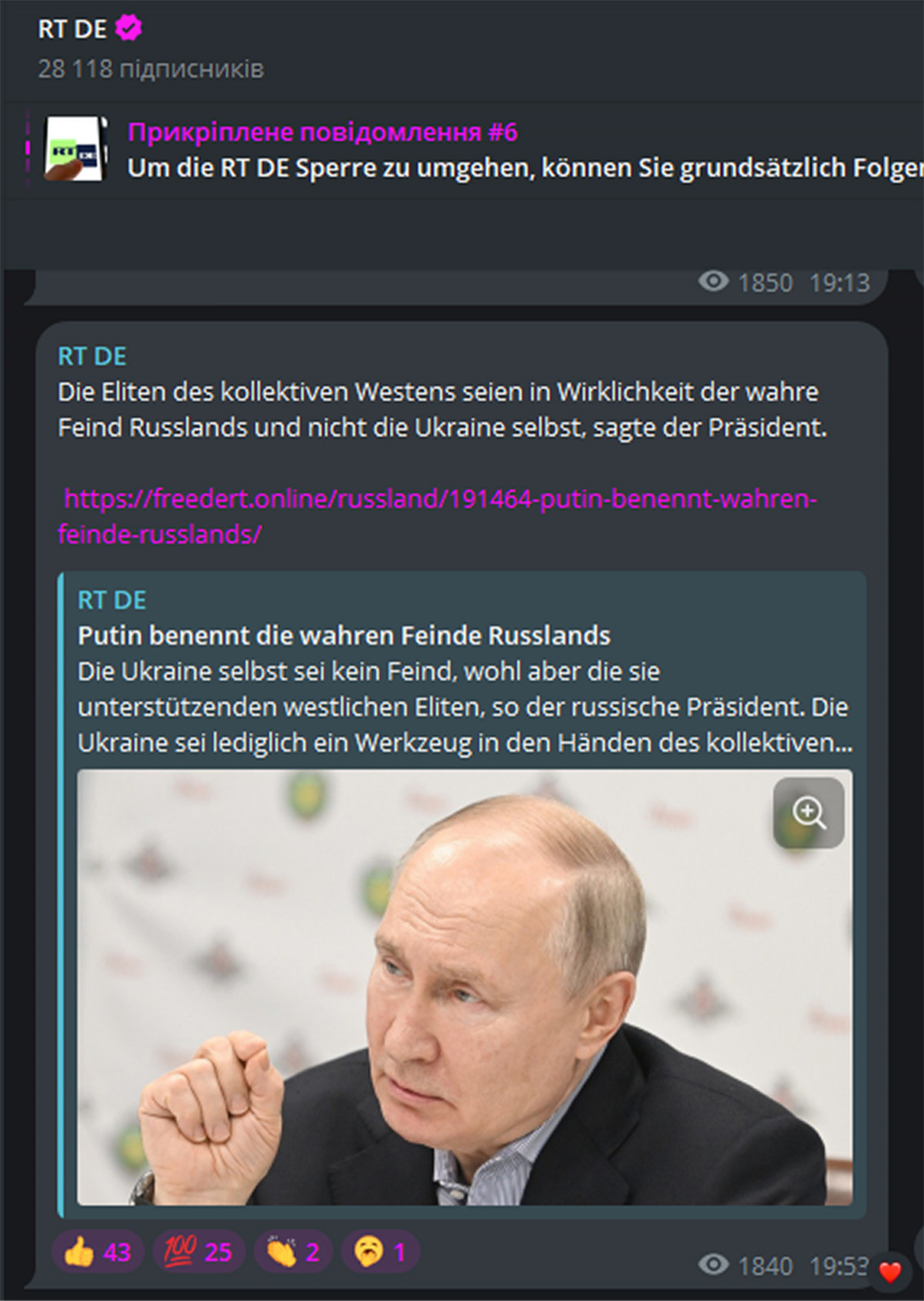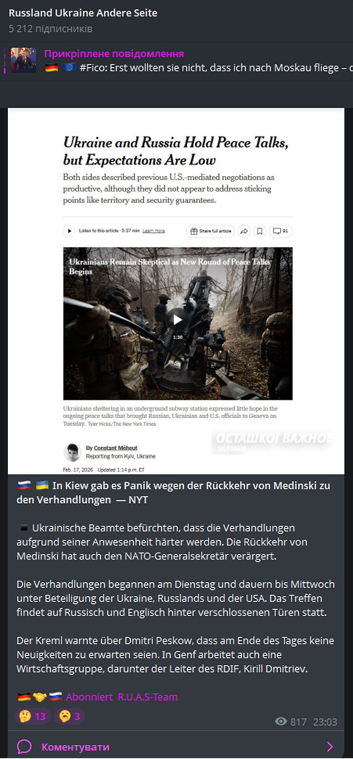 Водночас екосистема російського впливу не обмежується лише імітацією традиційних медіа. Для трансляції тез, які є занадто токсичними навіть для RT, використовується мережа дрібніших агрегаторів. Зокрема, телеграм-канал «Russland Ukraine Andere Seite» слугувала майданчиком для поширення найрадикальніших наративів, які офіційна пропаганда уникала транслювати напряму. Аналіз динаміки контенту виявляє показову трансформацію: якщо у 2024 році стрічка була майже тотально сфокусована на Україні, яку агресивно висміювали для розпалювання зловтіхи, то до лютого 2026 року частка української тематики суттєво зменшилася. Тепер акцент змістився на висвітлення внутрішніх подій у Німеччині. Автори каналу активно використовують різноманітні інформаційні приводи — від політичних рішень уряду до соціально-економічних проблем.