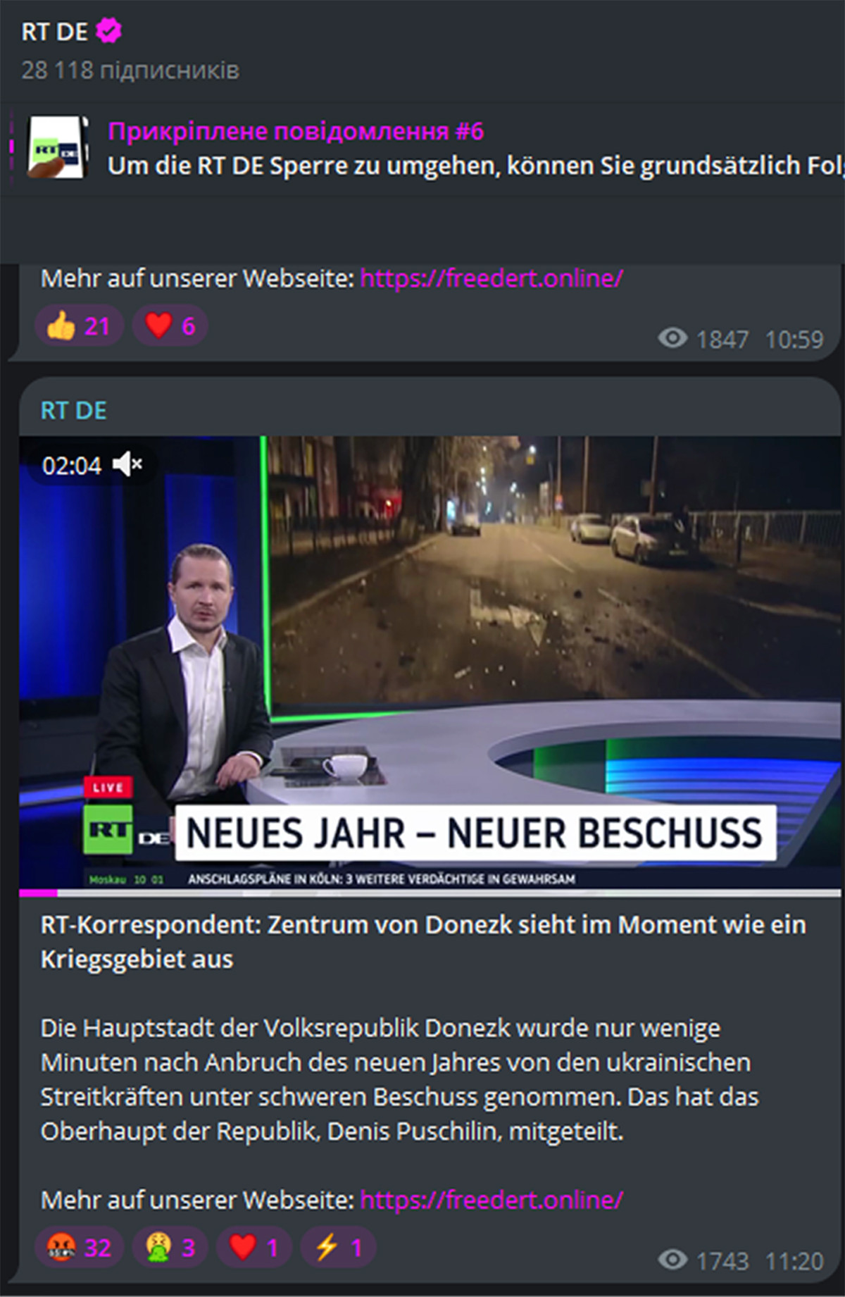 Знімки екранів із телеграм-каналу RT DE. Переклад тексту: Кореспондент RT: Центр Донецька наразі виглядає як зона війни. Столиця Донецької Народної Республіки потрапила під сильний обстріл українських військових лише через кілька хвилин після настання нового року. Про це повідомив глава республіки Денис Пушилін.