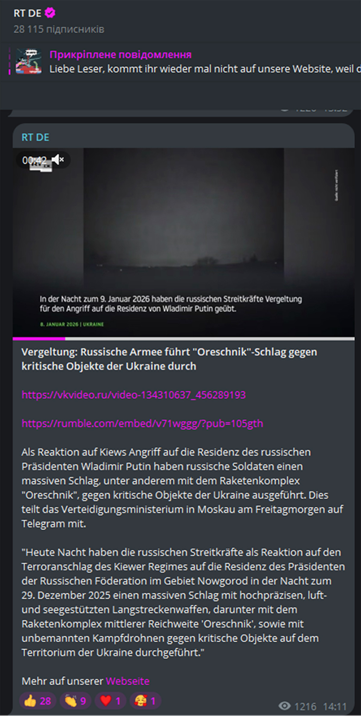Знімок екрана з телеграм каналу RT DE. Переклад: Відплата: російська армія завдає удару «Орешником» по критично важливих об’єктах України. У відповідь на напад Києва на резиденцію російського президента Володимира Путіна російські військові завдали масового удару, зокрема за допомогою ракетного комплексу «Орешник», по критично важливих об’єктах України. Про це повідомило Міністерство оборони в Москві в п’ятницю вранці в телеграмі. «Сьогодні вночі російські війська у відповідь на терористичний акт київського режиму проти резиденції президента Російської Федерації в Новгородській області в ніч на 29 грудня 2025 року завдали масового удару високоточними ракетами дальнього радіусу дії повітряного і морського базування, зокрема за допомогою ракетного комплексу середньої дальності “Орешник”, а також безпілотними ударними дронами по критично важливих об’єктах на території України».