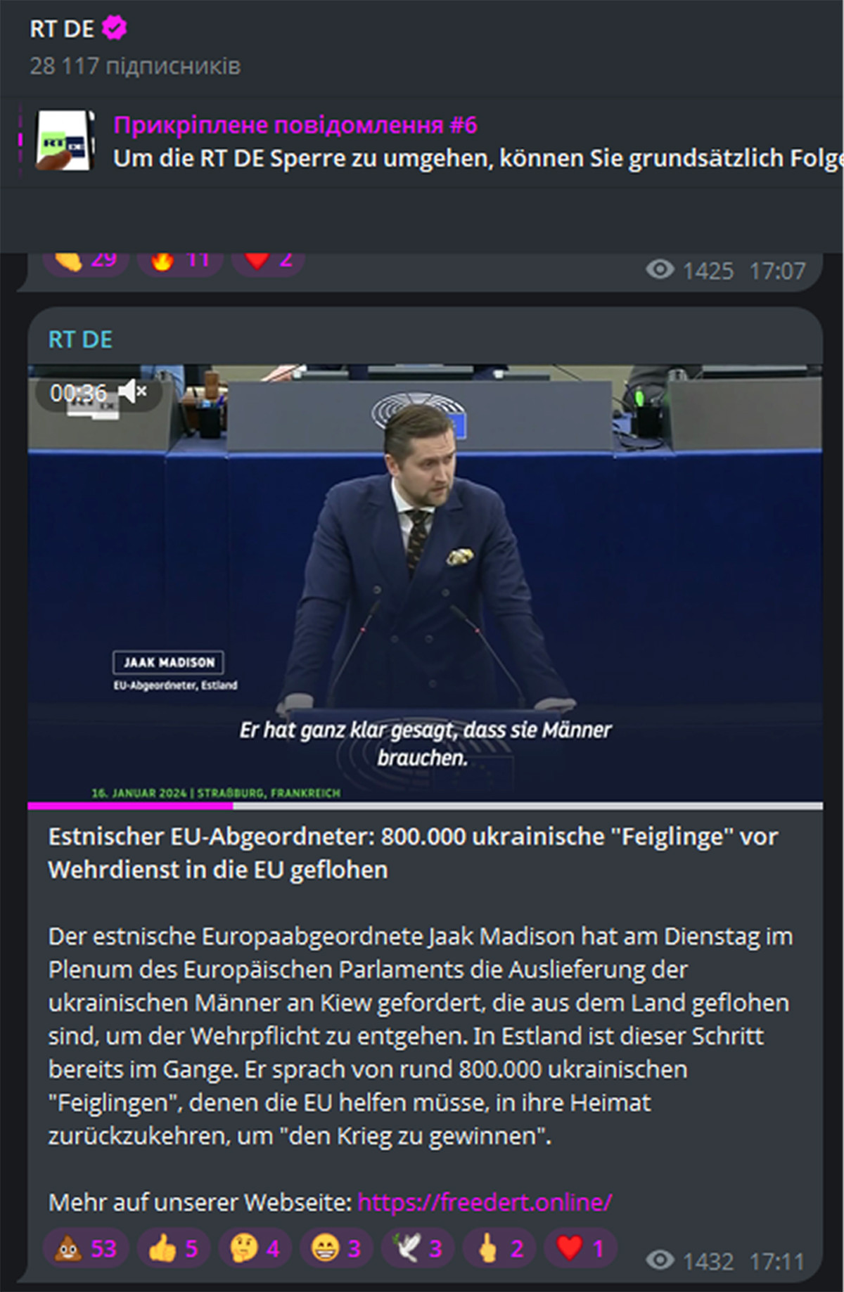 Знімок екрана з телеграм-каналу RT DE. Переклад: Естонський депутат Європарламенту: 800 000 українських «боягузів» утекли до ЄС, щоб уникнути військової служби. Естонський депутат Європарламенту Яак Мадісон у вівторок на пленарному засіданні Європейського парламенту закликав видати Києву українських чоловіків, які втекли з країни, щоб уникнути військової служби. В Естонії цей процес уже розпочався. Він назвав їх приблизно 800 000 українських «боягузів», яким ЄС має допомогти повернутися на батьківщину, щоб «виграти війну».