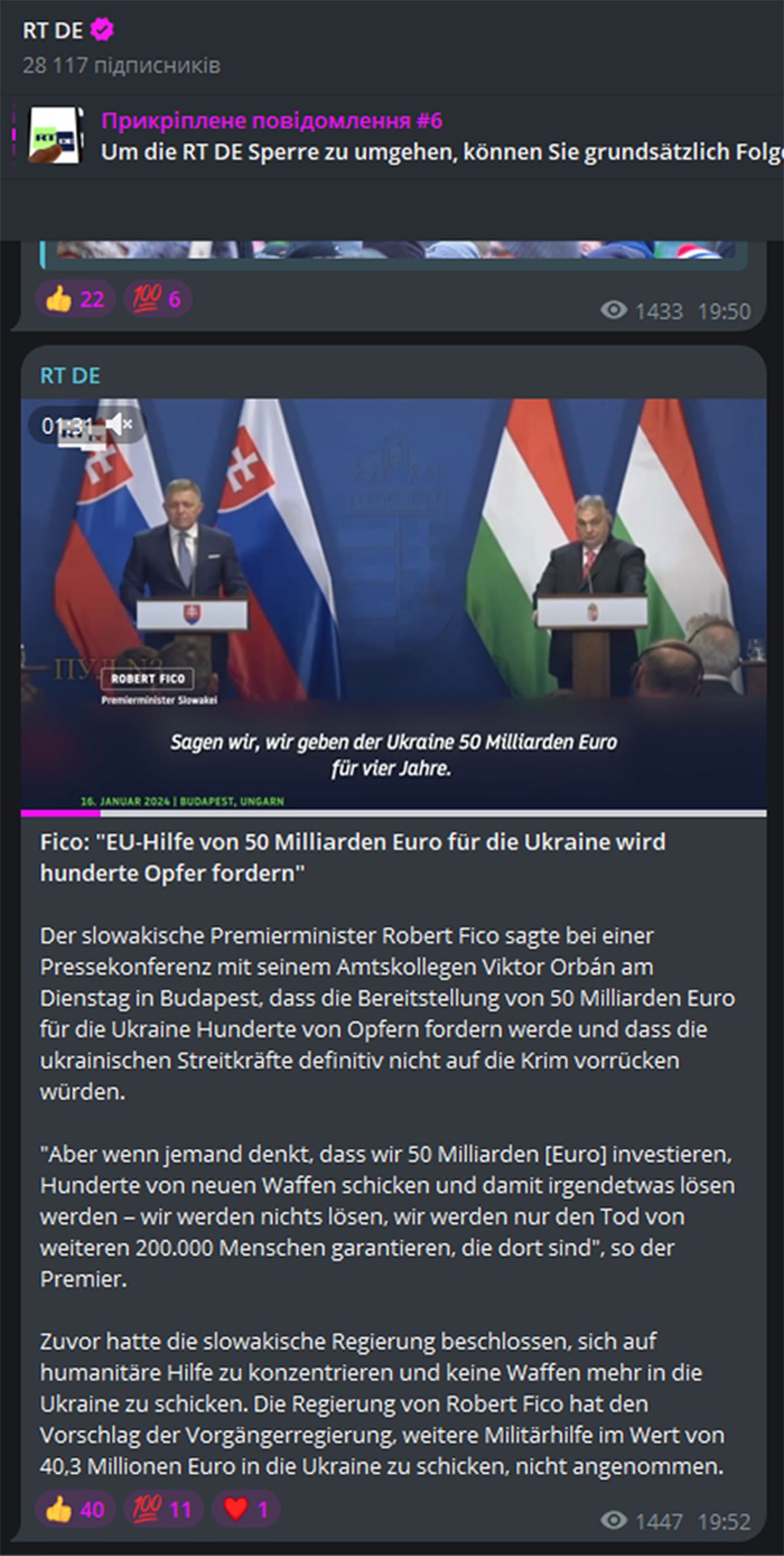 Знімок екрана з телеграм каналу RT DE. Переклад: Фіцо: «Допомога ЄС Україні у розмірі 50 мільярдів євро спричинить сотні жертв». Словацький прем’єр-міністр Роберт Фіцо заявив на пресконференції зі своїм колегою Віктором Орбаном у вівторок у Будапешті, що надання 50 мільярдів євро Україні призведе до сотень жертв і що українські війська точно не нападуть на Крим. «Але якщо хтось думає, що ми інвестуємо 50 мільярдів [євро], відправляємо сотні нових озброєнь і таким чином вирішимо проблему — ми нічого не вирішимо, ми лише гарантуємо смерть ще 200 000 людей, які там перебувають», — сказав прем’єр-міністр. Раніше словацький уряд вирішив зосереджуватися на гуманітарній допомозі і не відправляти більше зброї в Україну. Уряд Роберта Фіцо не прийняв пропозицію попереднього уряду надіслати додаткову військову допомогу в розмірі 40,3 мільйона євро в Україну.
