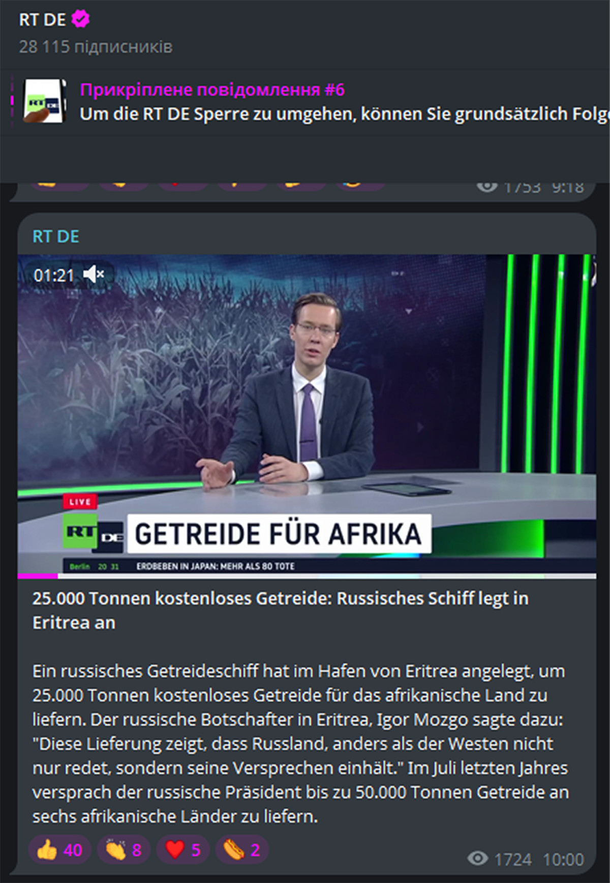 Знімок екрана з телеграм каналу RT DE. Переклад: 25 000 тонн безплатного зерна: російський корабель прибув до Еритреї. Російський зерновий корабель прибув до порту Еритреї, щоб доставити 25 000 тонн безплатного зерна для африканської країни. Російський посол в Еритреї Ігор Мозго сказав із цього приводу: «Ця поставка показує, що Росія, на відміну від Заходу, не просто говорить, а виконує свої обіцянки». У липні минулого року російський президент пообіцяв поставити до 50 000 тонн зерна до шести африканських країн.