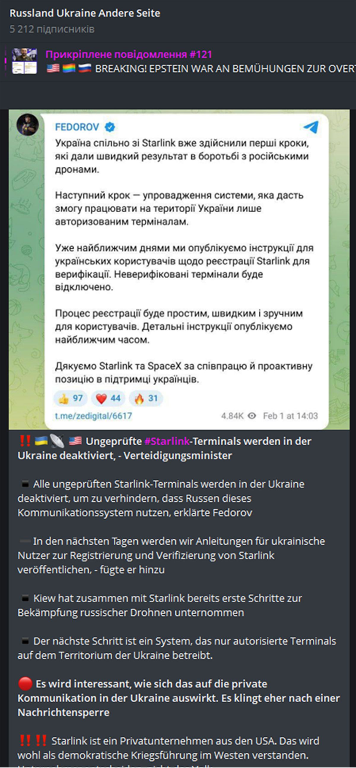 Знімок екрана з телеграм-каналу Russland Ukraine Andere Seite: Неперевірені Starlink-термінали деактивуються в Україні, — міністр оборони. Всі неперевірені термінали Starlink будуть деактивовані в Україні, щоб запобігти використанню цієї системи зв’язку росіянами, пояснив Федоров. У найближчі дні ми опублікуємо інструкції для українських користувачів щодо реєстрації та верифікації Starlink, — додав він. Київ уже зробив перші кроки разом із Starlink для боротьби з російськими дронами. Наступний крок — система, яка буде працювати тільки з авторизованими терміналами на території України. Цікаво, як це вплине на приватне спілкування в Україні. Це більше схоже на цензуру новин. Starlink — приватна компанія з США. Це, напевно, буде розглядатися як демократичне ведення війни на Заході. Підприємці приймають рішення, а не народ