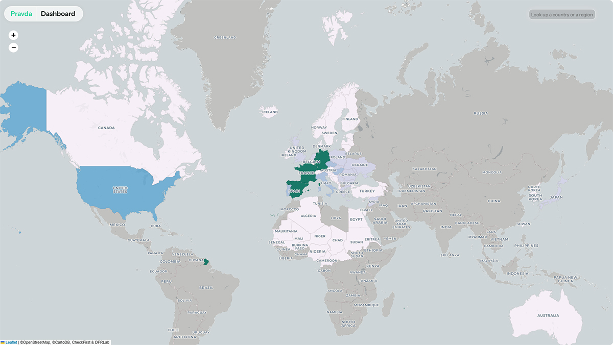 Географічний розподіл контенту можна простежити за допомогою платформи Pravda Dashboard, створеної фінською компанією з розробки програмного забезпечення Check First і Лабораторією цифрових розслідувань (DFRLab), яка фіксує інформацію про кількість публікацій для різних країн.