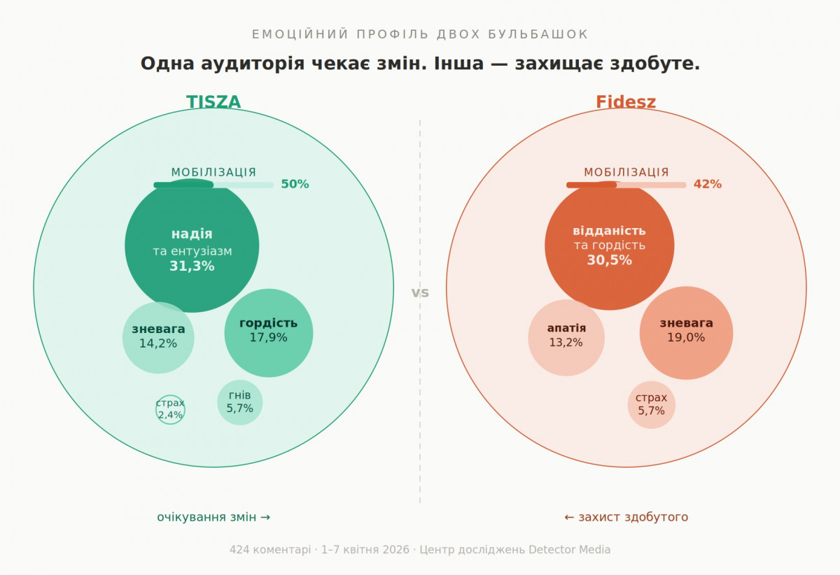 Кампанії «Фідес» і «Тиси» демонструють не просто дві різні стратегії — а два різні уявлення про те, як функціонує політична комунікація. «Фідес» веде кампанію, в якій кожний допис добудовує стіну між «нами» і «ними». «Тиса» натомість робить ставку на різноманіття голосів і посил про те, що після 16 років щось може змінитися. Така асиметрія відображається і в коментарях: аудиторія «Тиси» мобілізується від надії, аудиторія «Фідес» — від тривоги перед втратою.