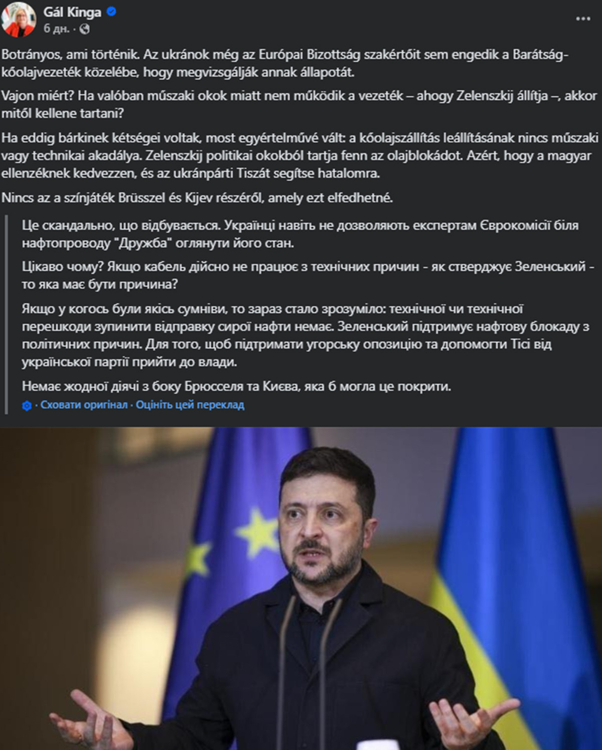 Скриншот допису Кінги Гал, присвяченого «нафтовій блокаді» Угорщини з боку України