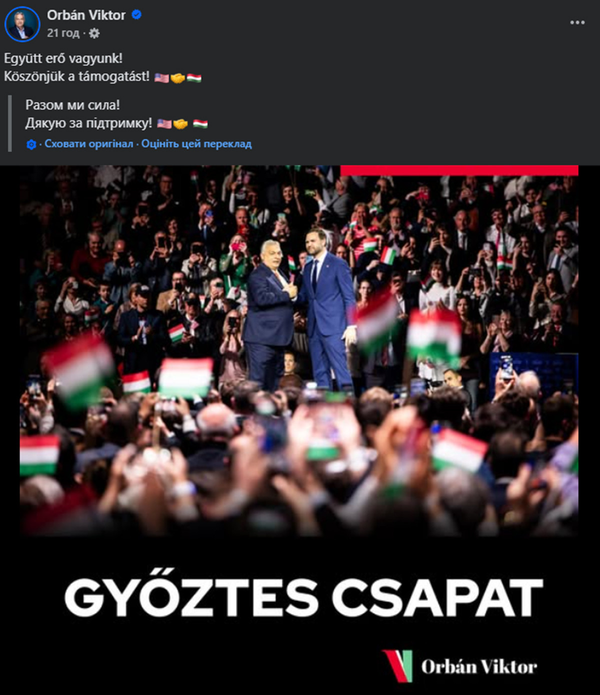 Повідомлення зі сторінки Віктора Орбана, присвячене візиту Джей Ді Венса