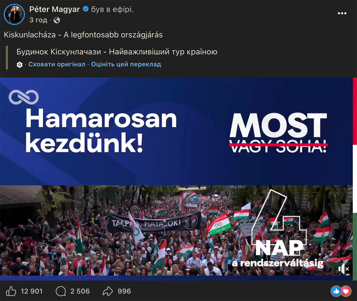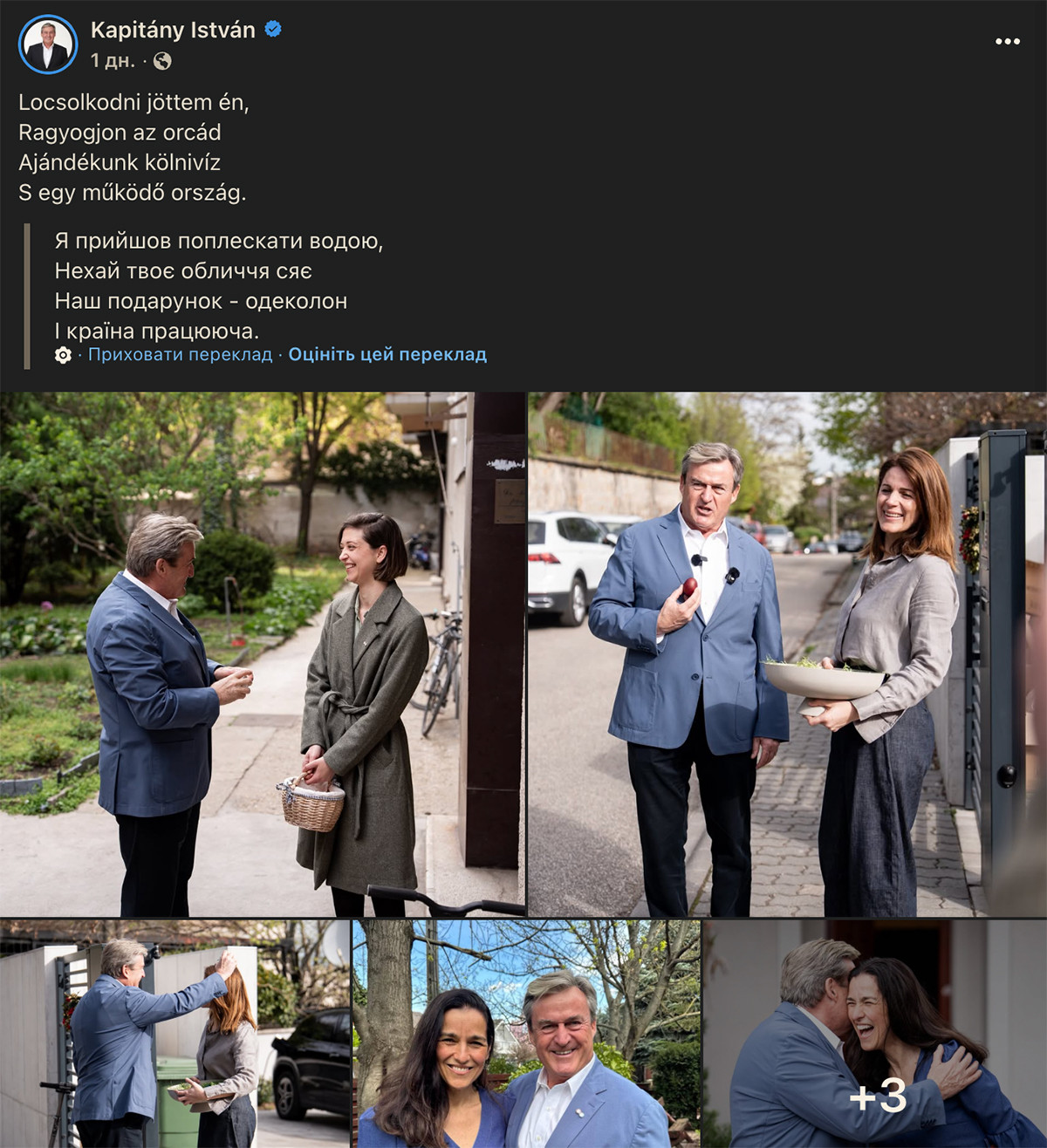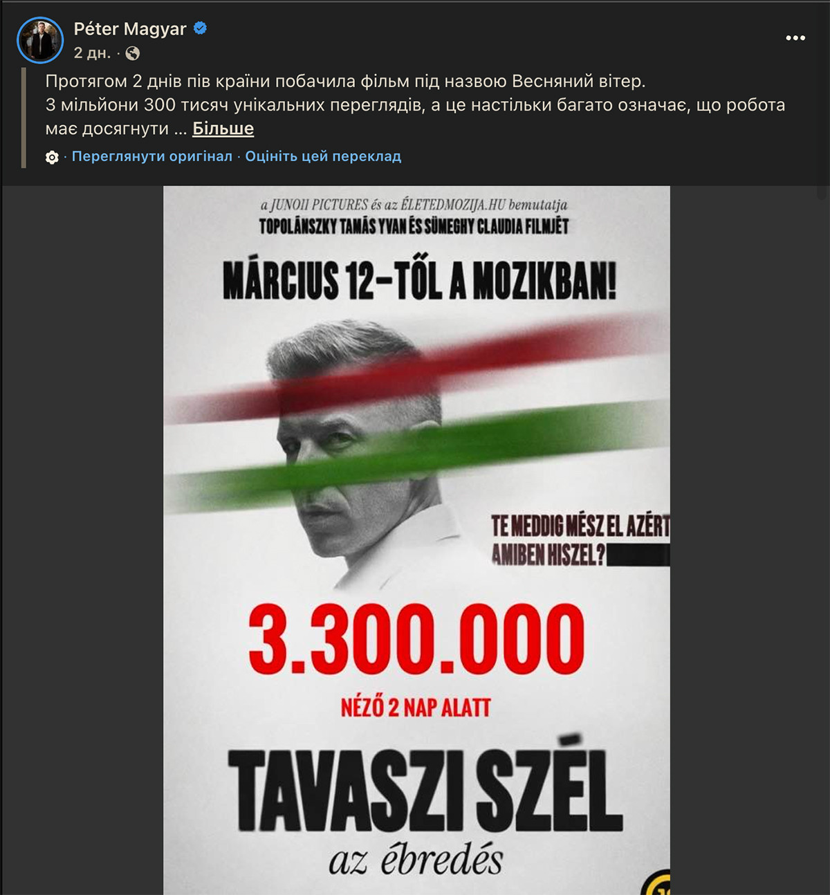 Приклад публікації від 8 квітня на фейсбук-сторінці Петера Мадяра про агітаційний тур та агітаційний фільм «Весняний вітер»